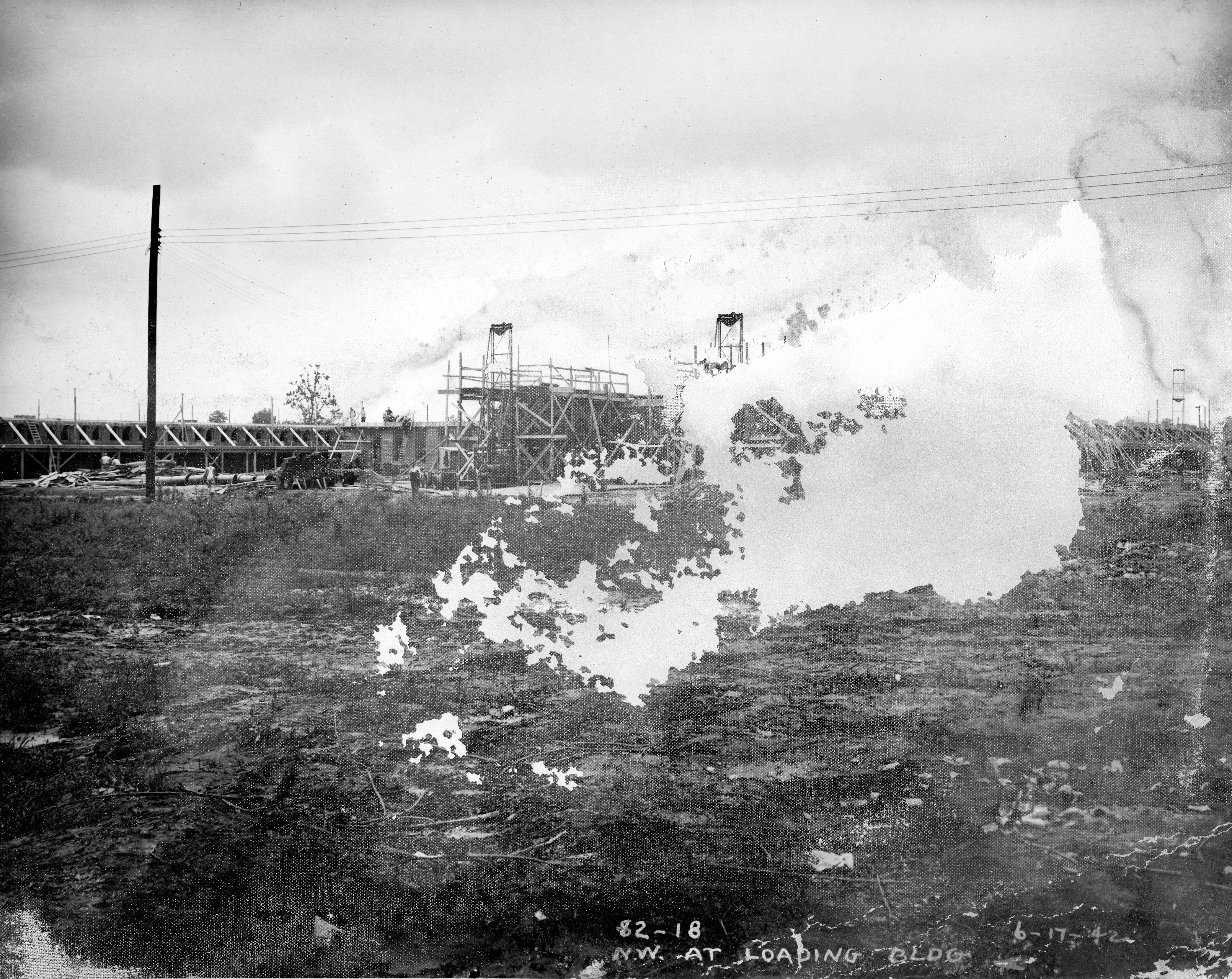 Looking northwest at loading building under construction at the Evansville Ordnance Plant at the Chrysler plant at 1625 N. Garvin St.