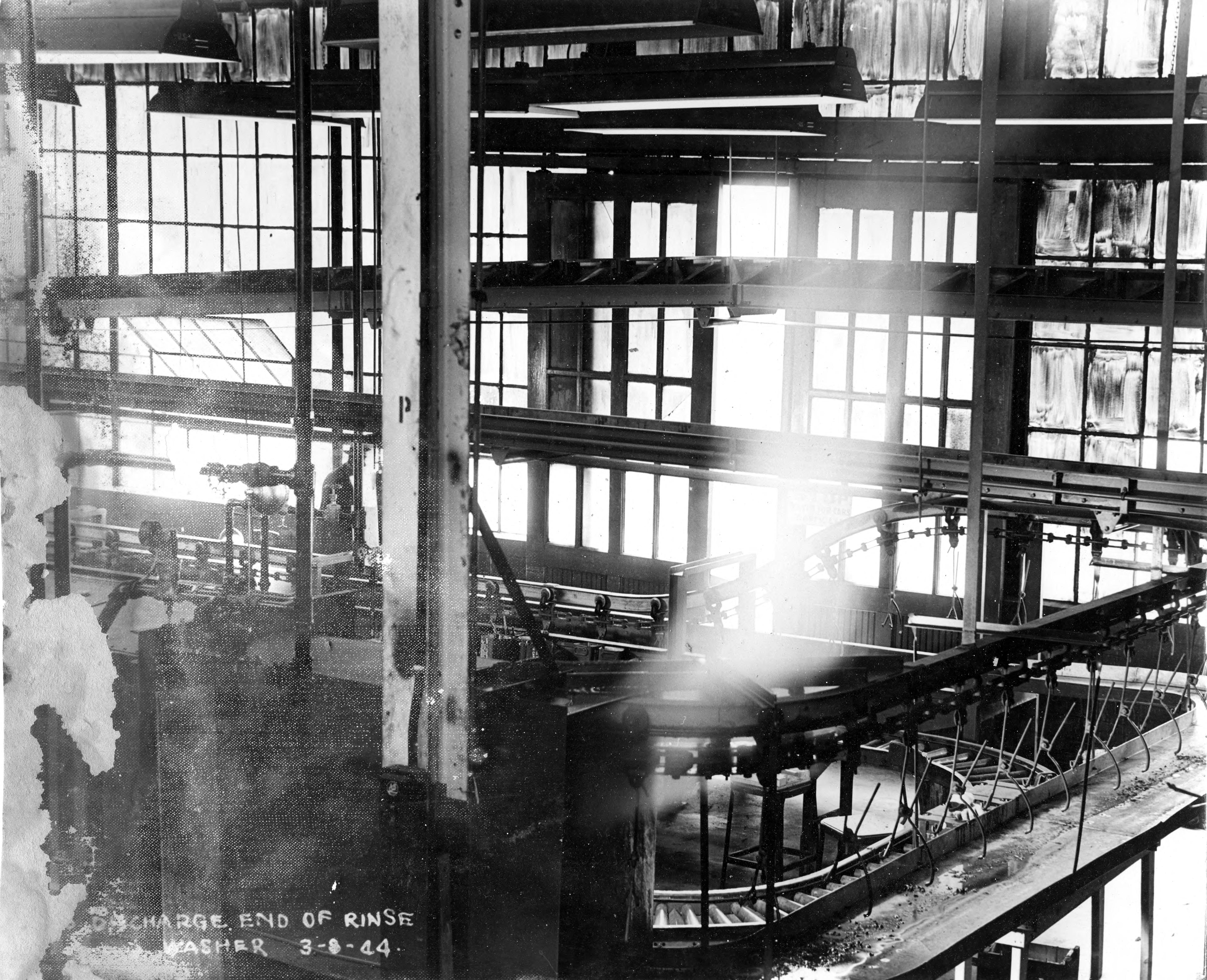 Discharge end of rinse washer at the Evansville Ordnance Plant at the Chrysler plant at 1625 N. Garvin St.
