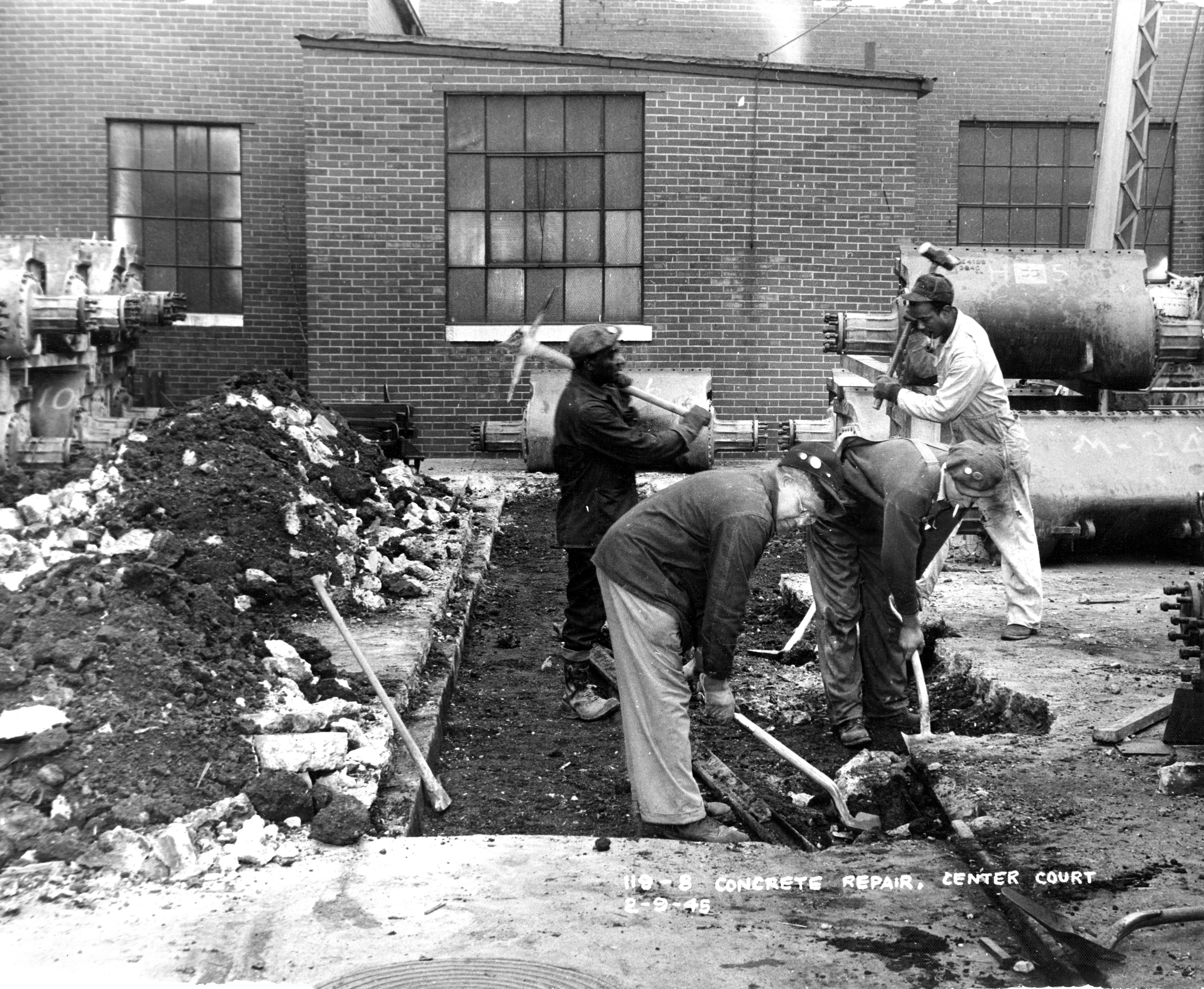 Men doing concrete repair, center court at the Evansville Ordnance Plant at the Chrysler plant at 1625 N. Garvin St.