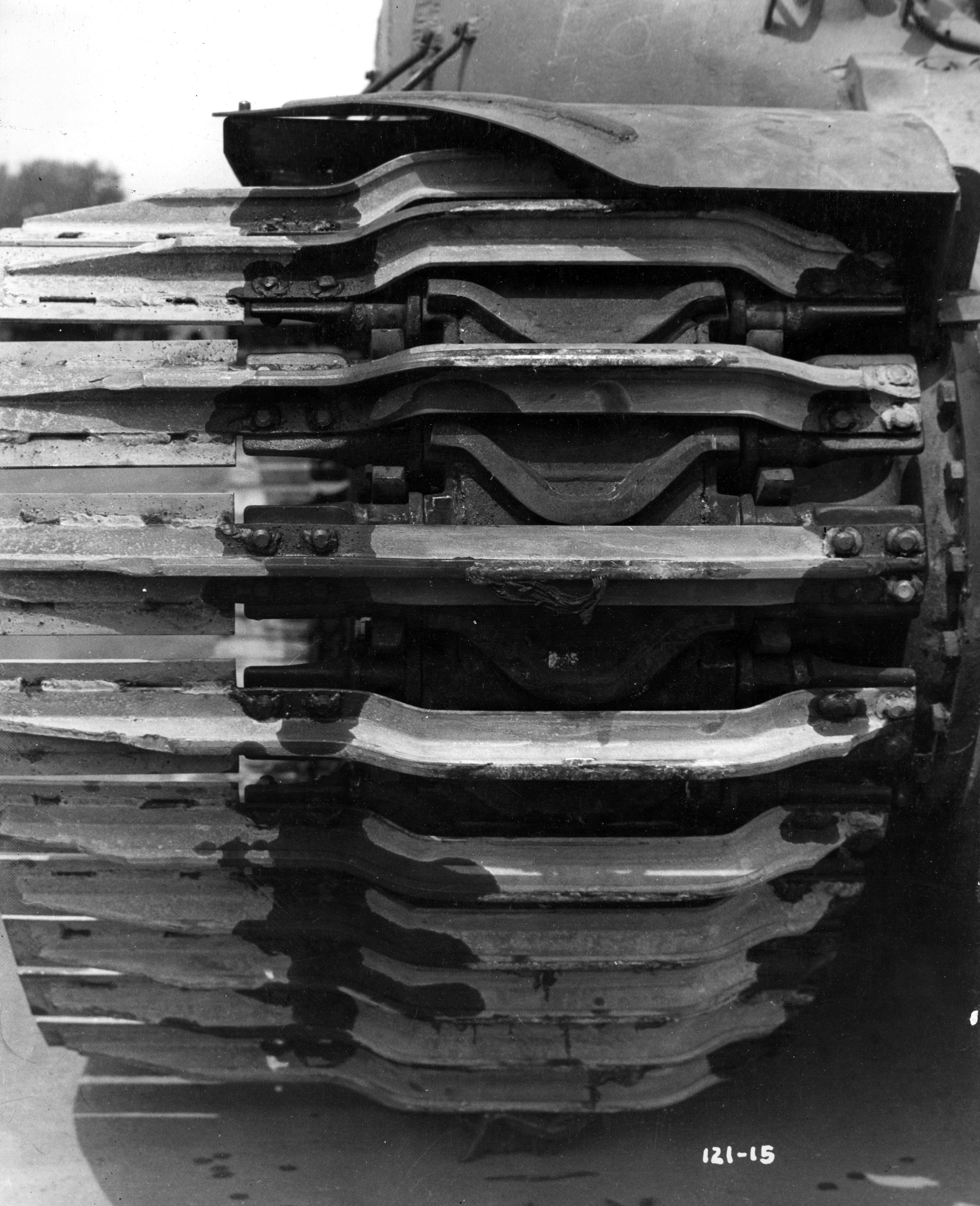 Close-up showing grouser installation on tank at the Evansville Ordnance Plant at the Chrysler plant at 1625 N. Garvin St. Grousers are devices designed to provide extra traction on continuous tracks.