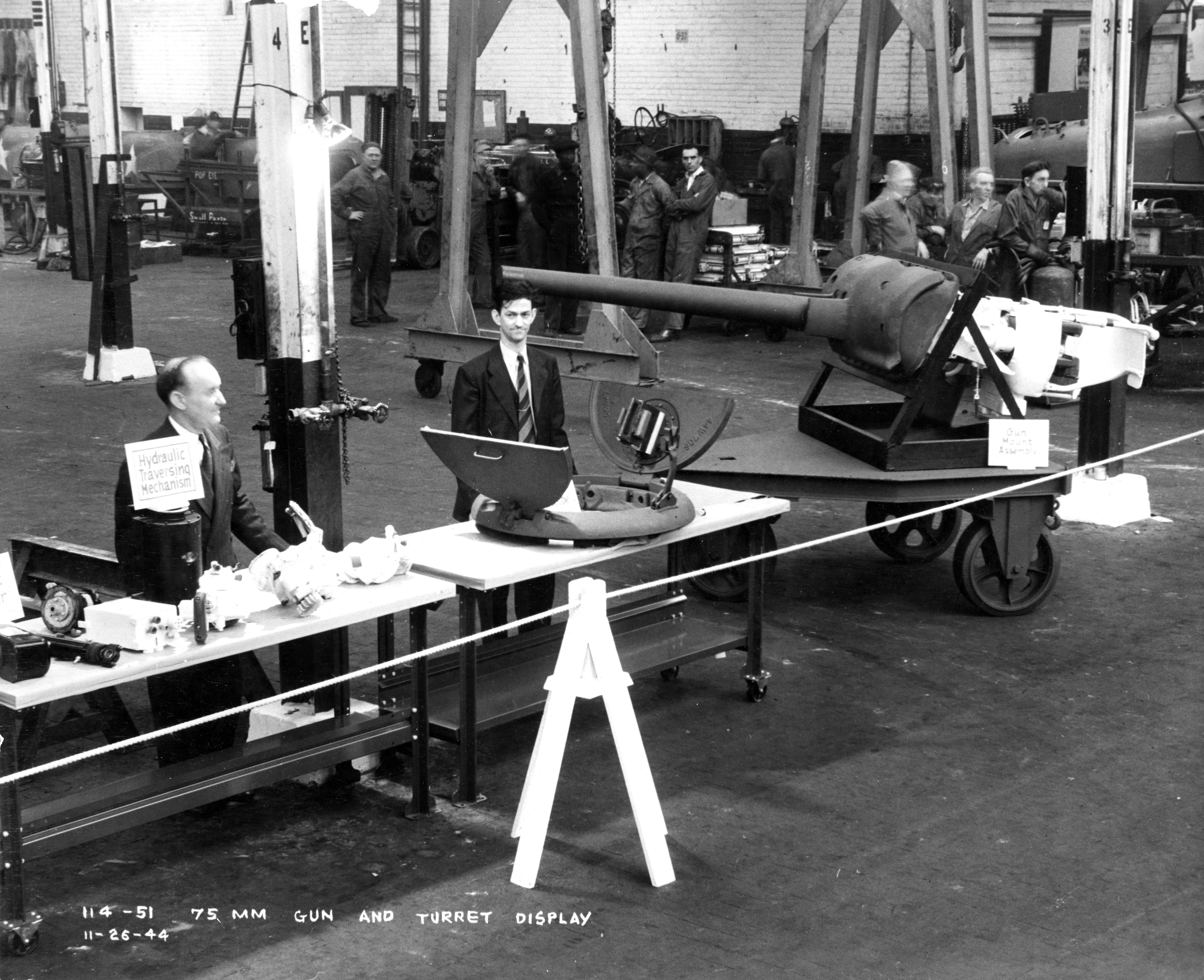 Display of 75 mm guns and turrets at the Evansville Ordnance Plant at the Chrysler plant in Evansville, Indiana