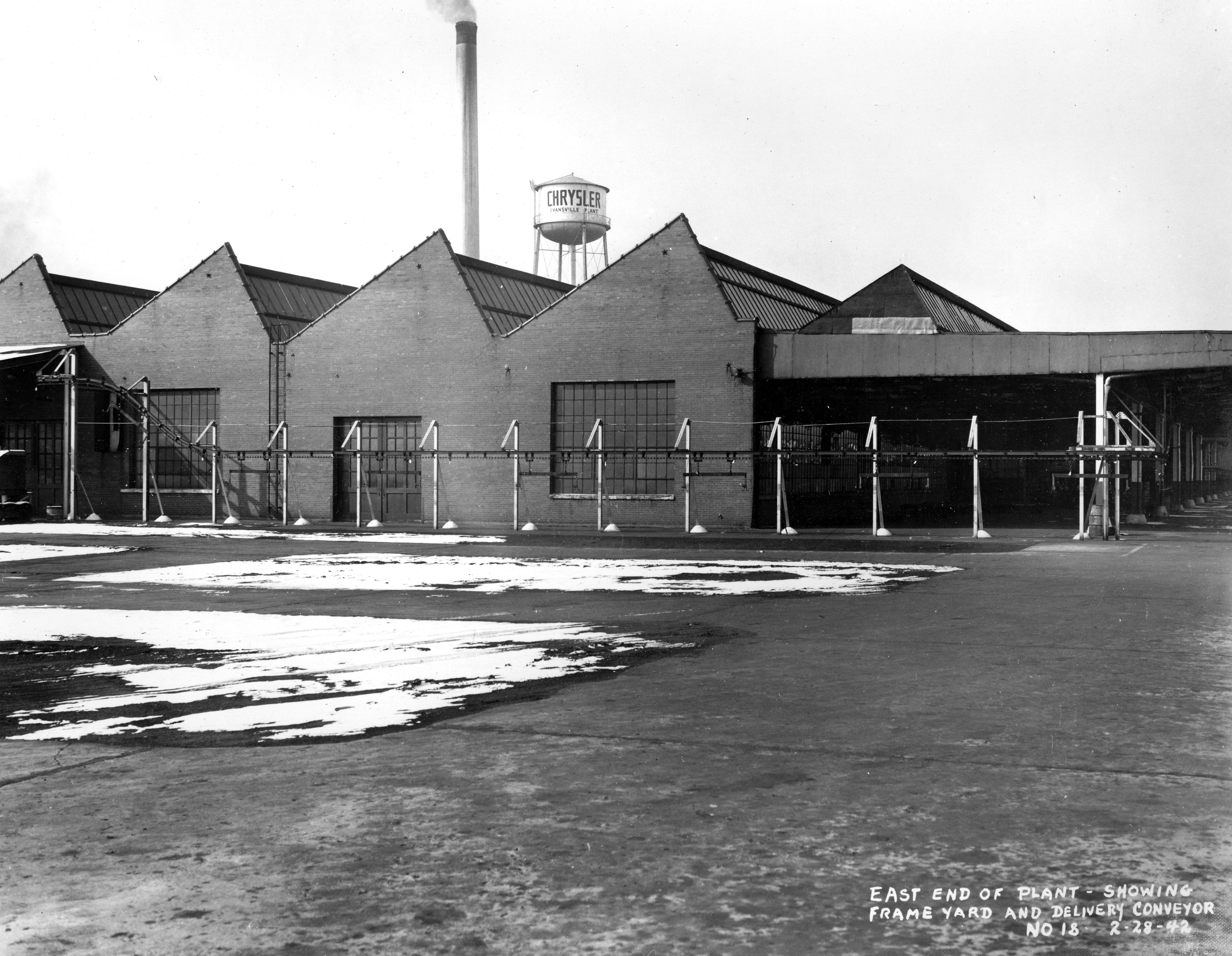 East end of plant, showing frame yard and delivery conveyor at the Evansville Ordnance Plant at the Chrysler plant at 1625 N. Garvin St.