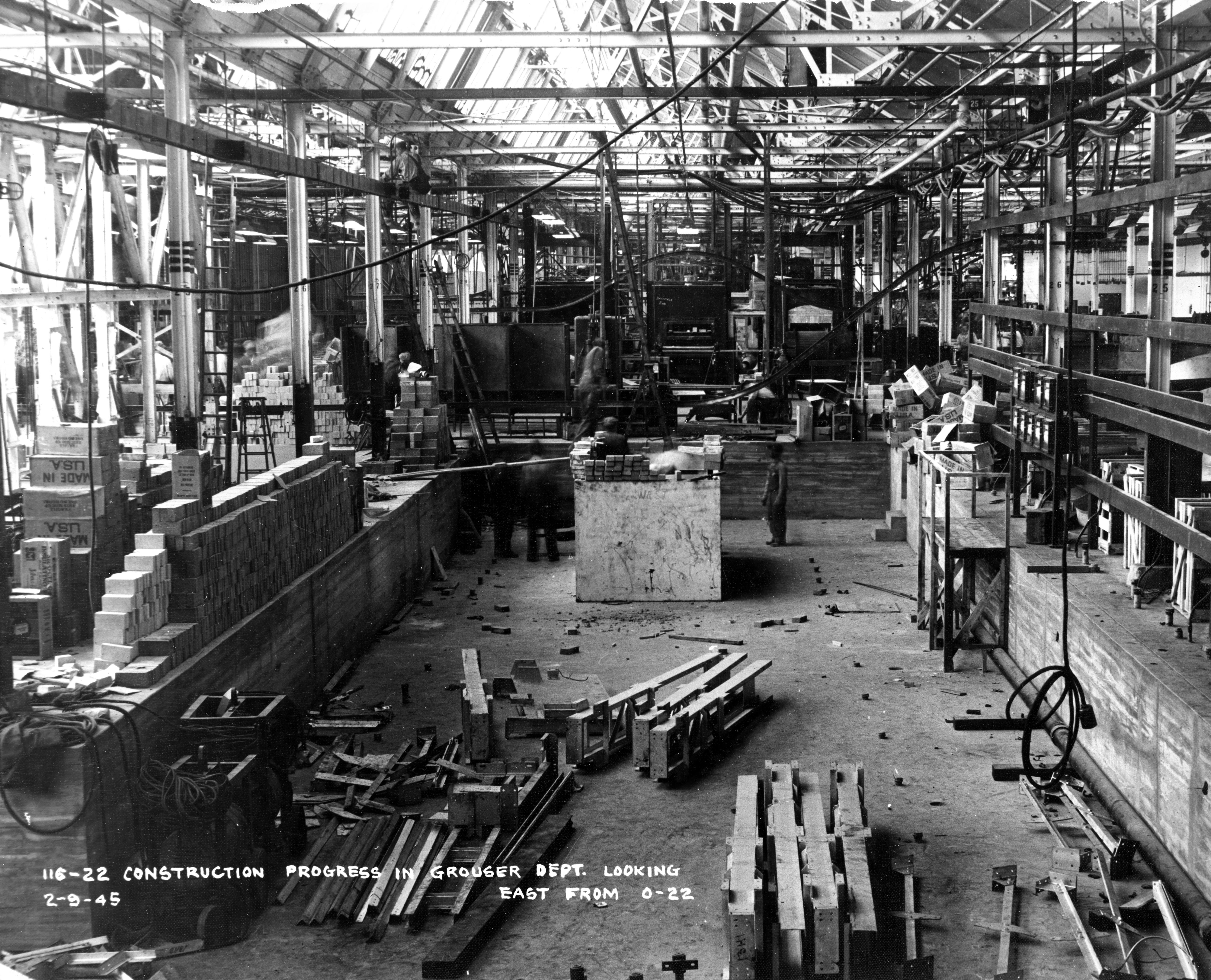 Construction progress in grouser department looking east from O-22 at the Evansville Ordnance Plant at the Chrysler plant at 1625 N. Garvin St. Grousers are devices designed to provide extra traction on continuous tracks.