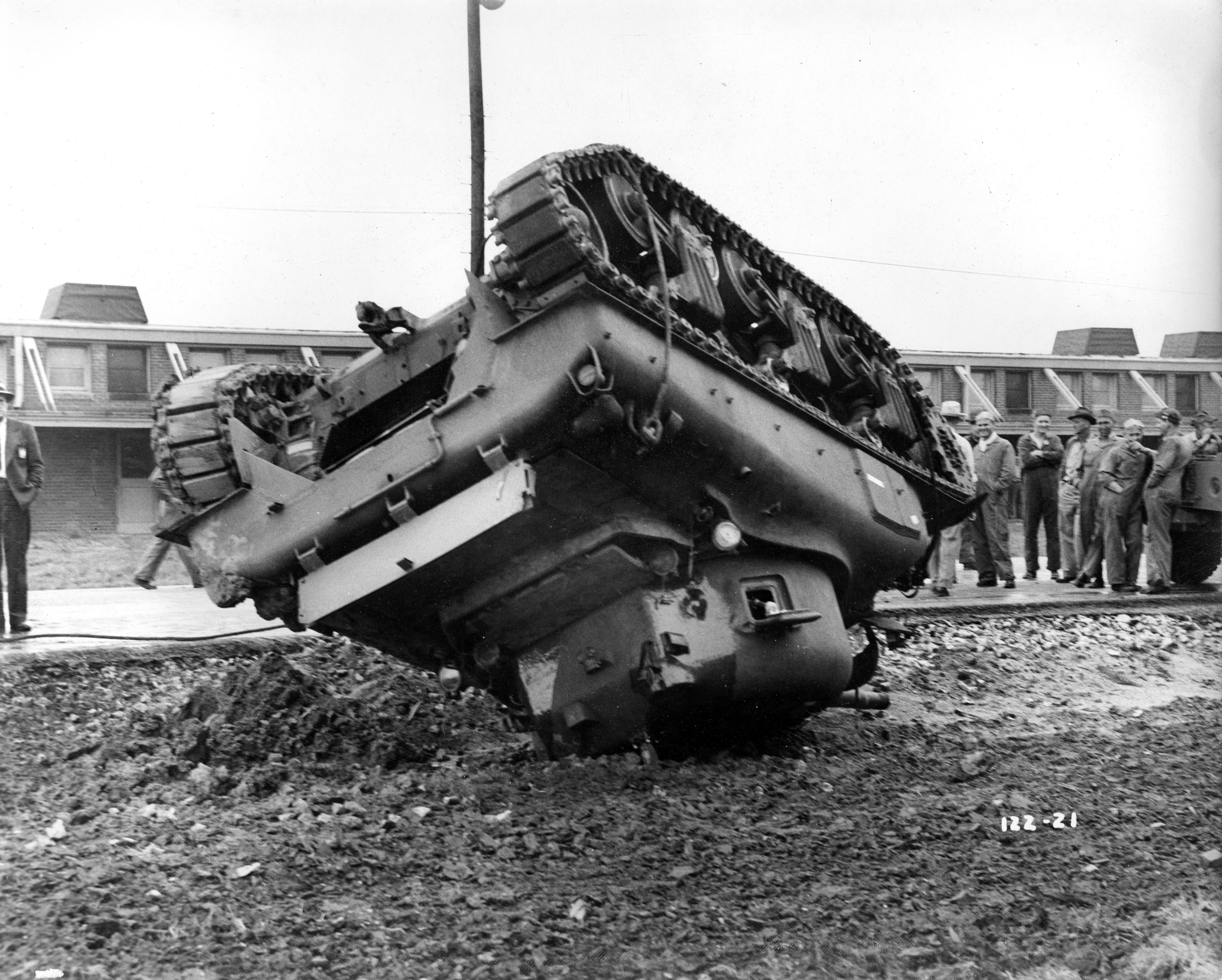 Overturned tank at the Evansville Ordnance Plant at the Chrysler plant in Evansville, Indiana