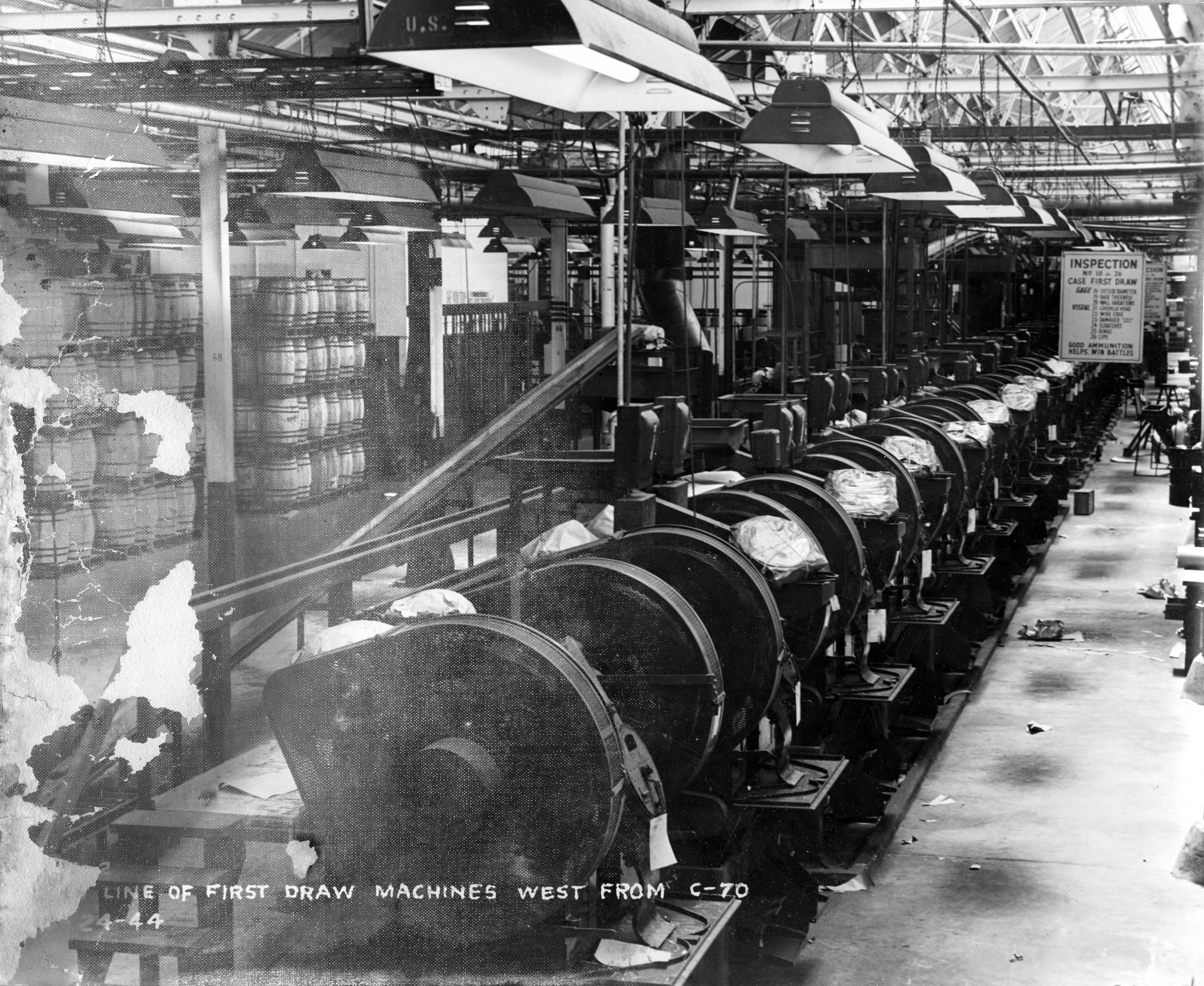 Looking west from C-70 to a line of first draw machines at the Evansville Ordnance Plant at the Chrysler plant at 1625 N. Garvin St.