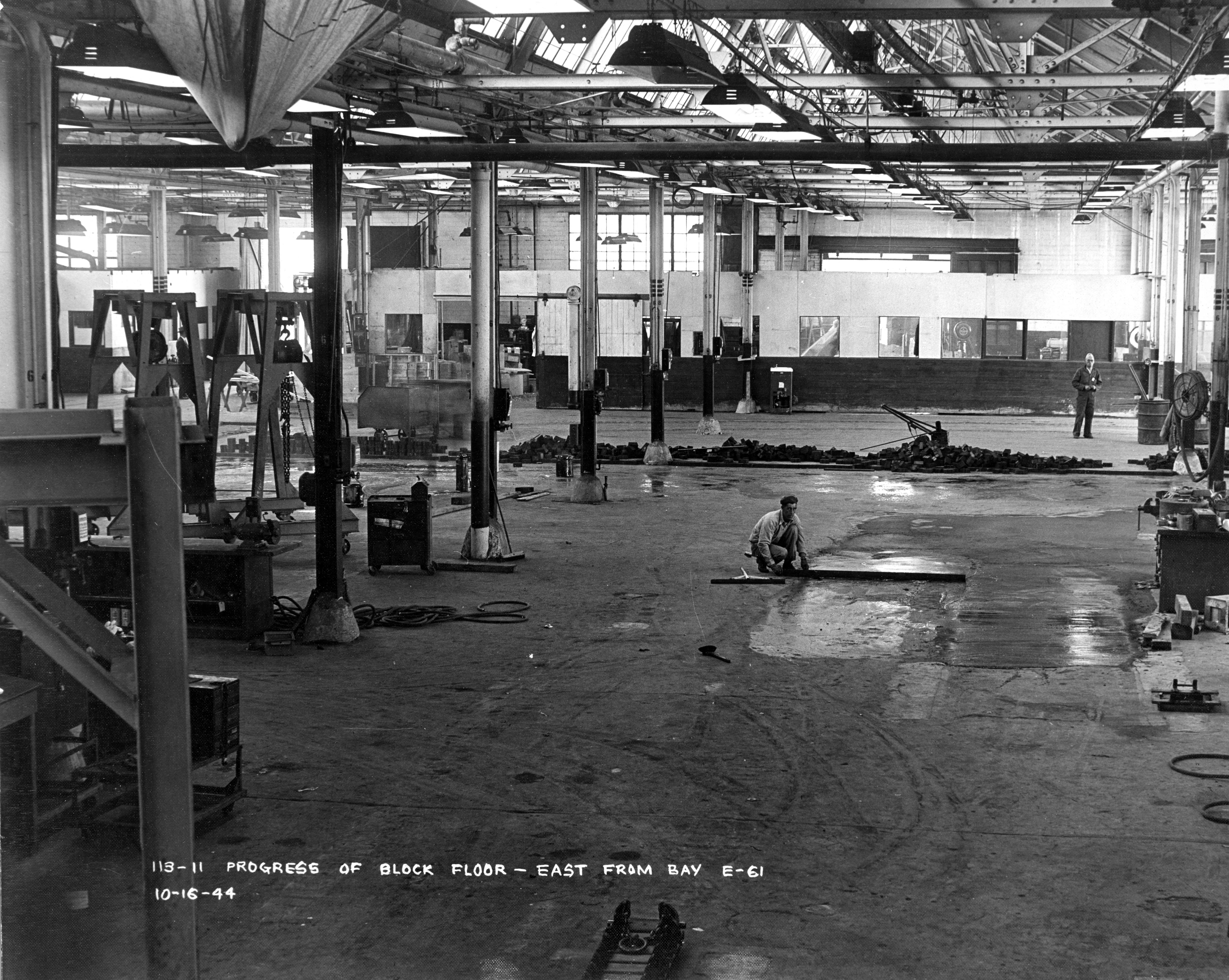 Man working on progress of block floor, looking east from Bay E-61, at the Evansville Ordnance Plant at the Chrysler plant at 1625 N. Garvin St.