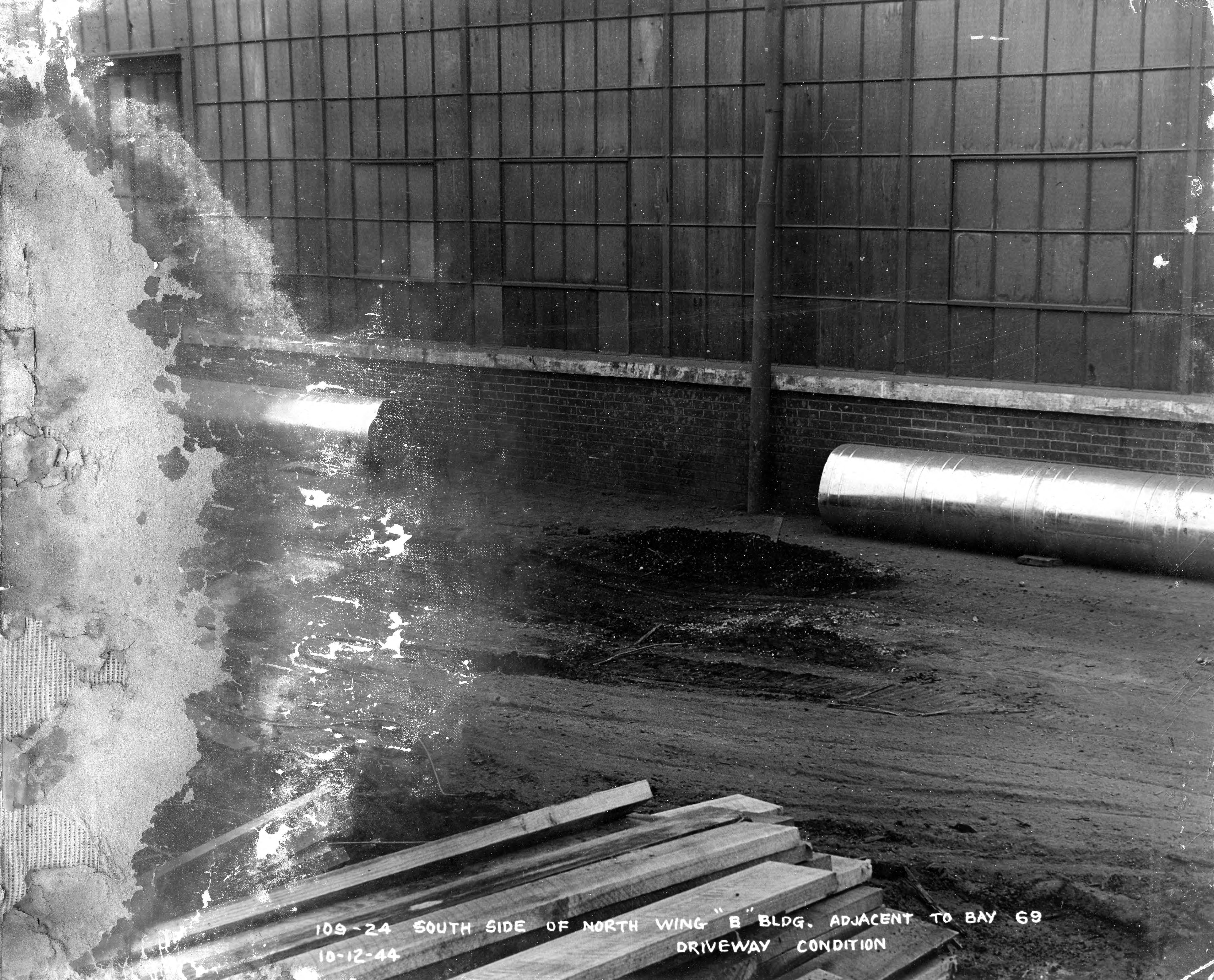 South side of north wing "B" building, adjacent to Bay 69, showing the driveway condition, at the Evansville Ordnance Plant at the Chrysler plant at 1625 N. Garvin St.