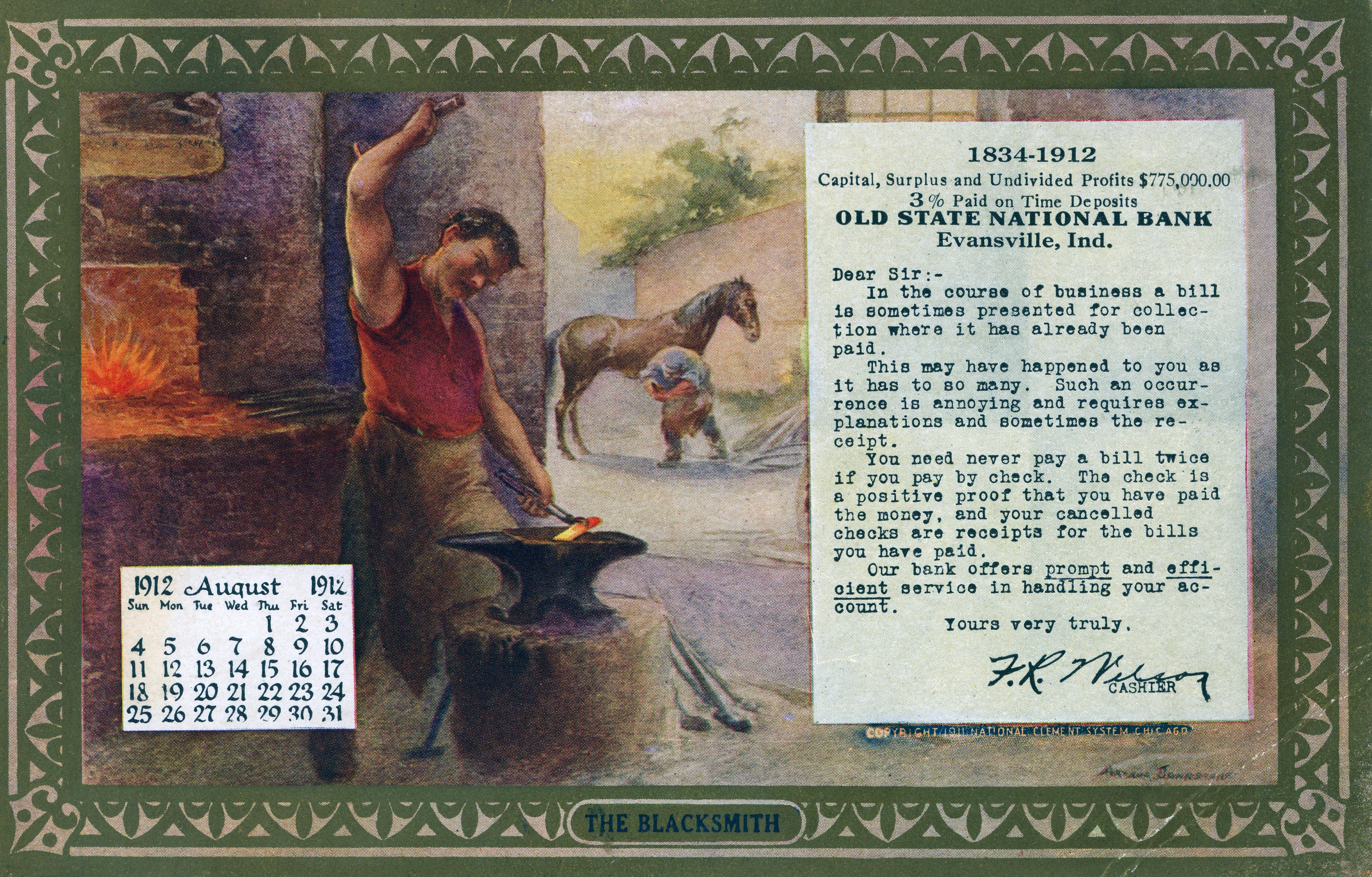 Old State National Bank at 420 Main St. The Old State National Bank was established in 1834 as a branch of the Old State Bank of Indiana. Its first location was a temporary quarters at Main St. and Water St.(Riverside). In 1835 it moved into a new building and was renamed Old National Bank in 1883. In 1916 it moved to the location shown, and in 1927 was altered/modernized (the view here is thought to be pre-1927). The bank moved again in 1970 and this building was razed. Old National Bank still exists today.