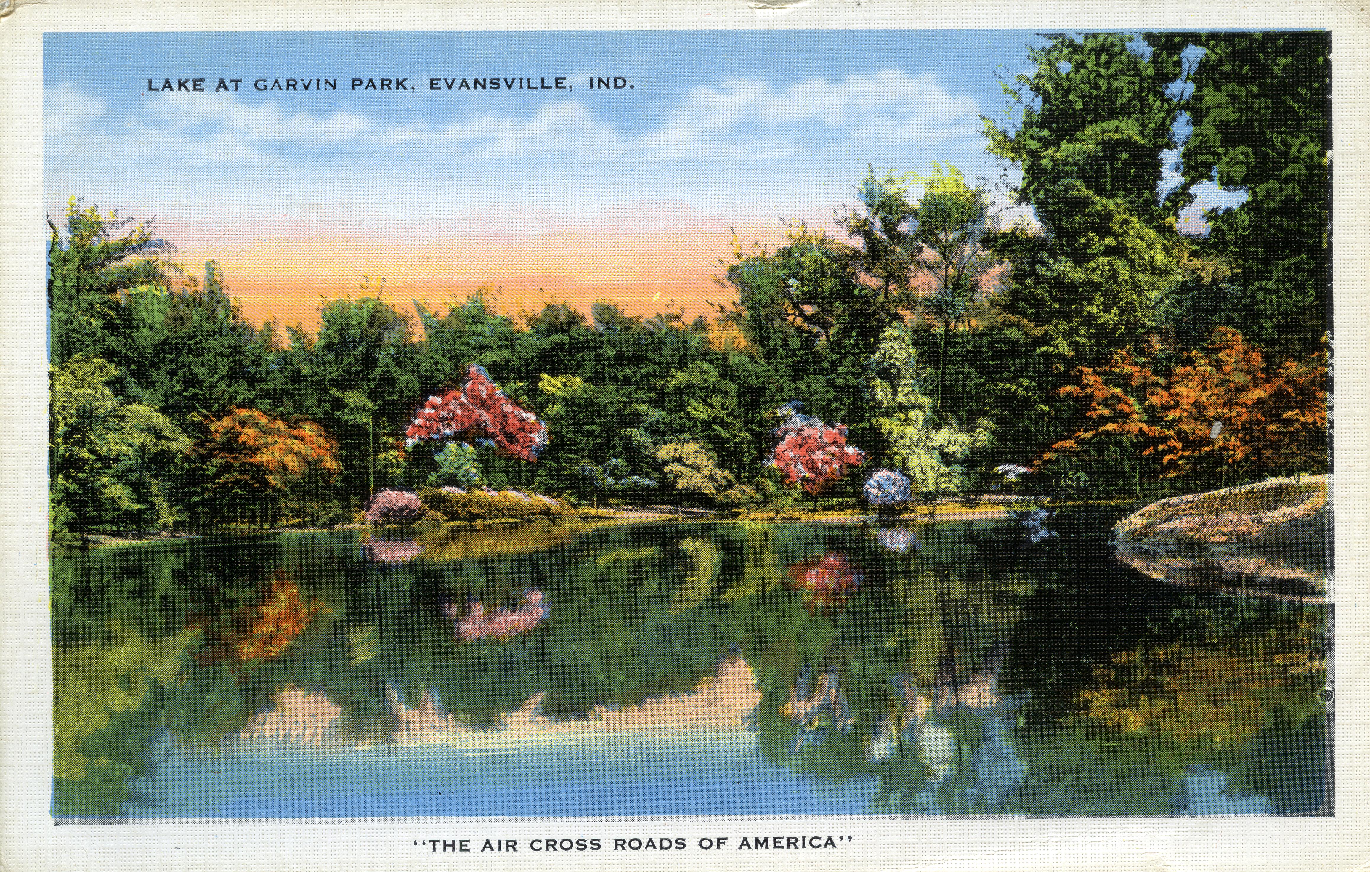 At the north end of Main Street was a wooded area owned by Thomas E. Garvin, a prominent Evansville attorney. First known as Garvin's Grove, it was open to the public and served as a retreat away from the city. In 1915, the land was given to the park system, thus establishing Garvin Park. Municipal parks received high priprity under Mayor Benjamin Bosse, and probably none more than Garvin Park. The park was laid out by a former student of Frederick Law Olmsted (who designed Central Park in New York City). The lake was built to remedy flooding from nearby Pigeon Creek. An entry gate and the electric fountain [seen here] were added shortly after the park opened. In the 1930s, architect Harry E. Boyle designed a bandstand and picnic shelter for the park. Amenities such as a pool, tennis courts, and playground equipment were added later. (Engler, Joe. Evansville. (Postcard History Series). Charleston, SC: Arcadia Publishing, 2012, p. 121-122)