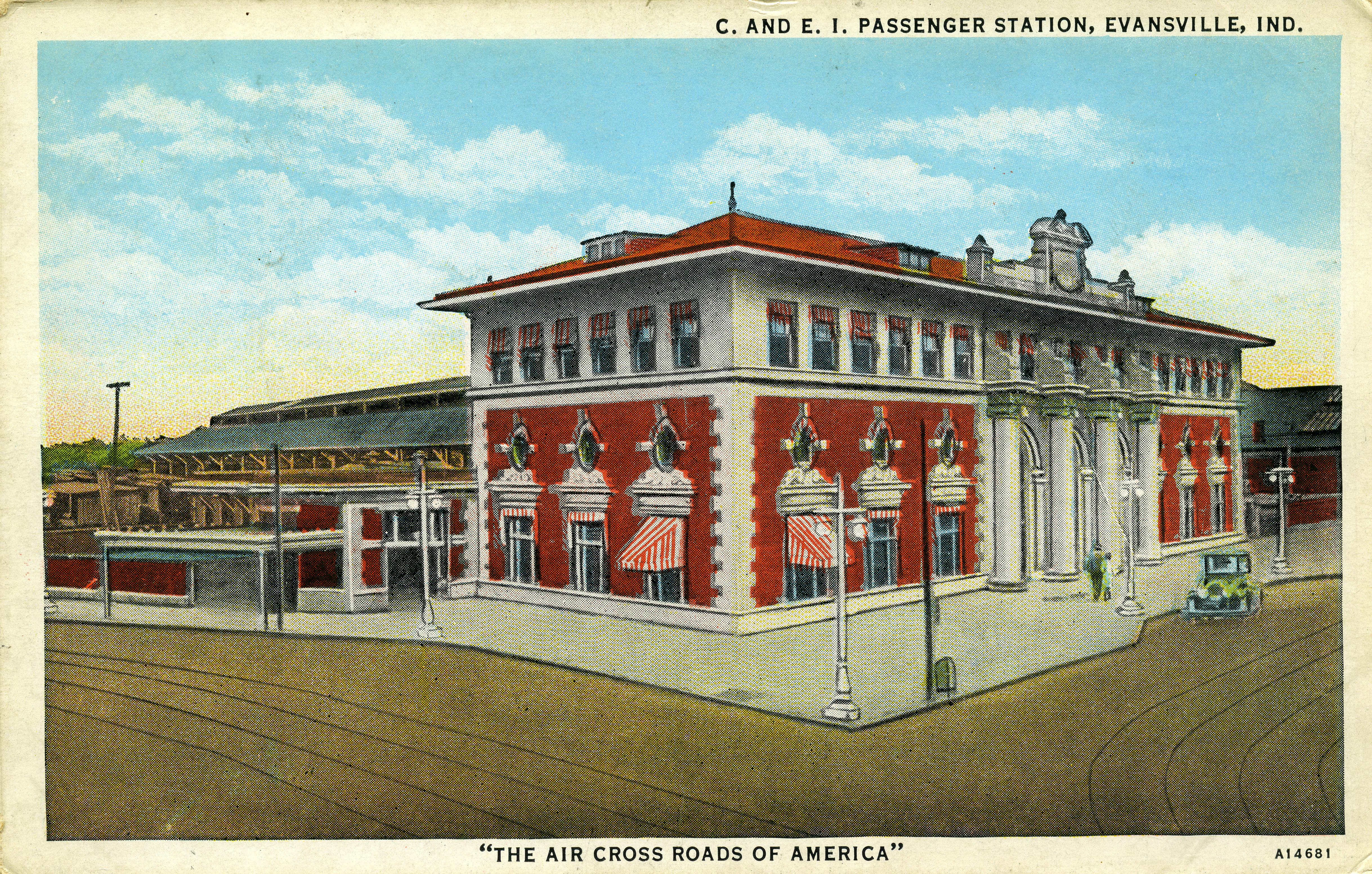 C and EI depot on SE 8th St. The Evansville and Terre Haute (E and TH) Railroad depot at Eighth and Main Streets was built in 1903 and 1904 and replaced the old Union Station on the corner of Eighth and Main Streets. It was later renamed the Chicago and Eastern Illinois (CandEI) Depot aft the E and TH was bought out. In the early 1930s, when the CandEI was taken over by the Louisville and Nashville (LandN) Railroad, this depot became redundant. It subsequently served as a USO Club, a community center, and even a car dealership. When the site was chosen for the new Evansville civic center complex, the depot's time was up. The four Ionic columns in front of the depot were salvaged when the depot was razed in the 1960s; they were integrated into the Four Freedoms Bicentennial Monument located on the riverfront, just beyond the foot of Walnut Street. (Engler, Joe. Evansville. (Postcard History Series). Charleston, SC: Arcadia Publishing, 2012, p. 91)