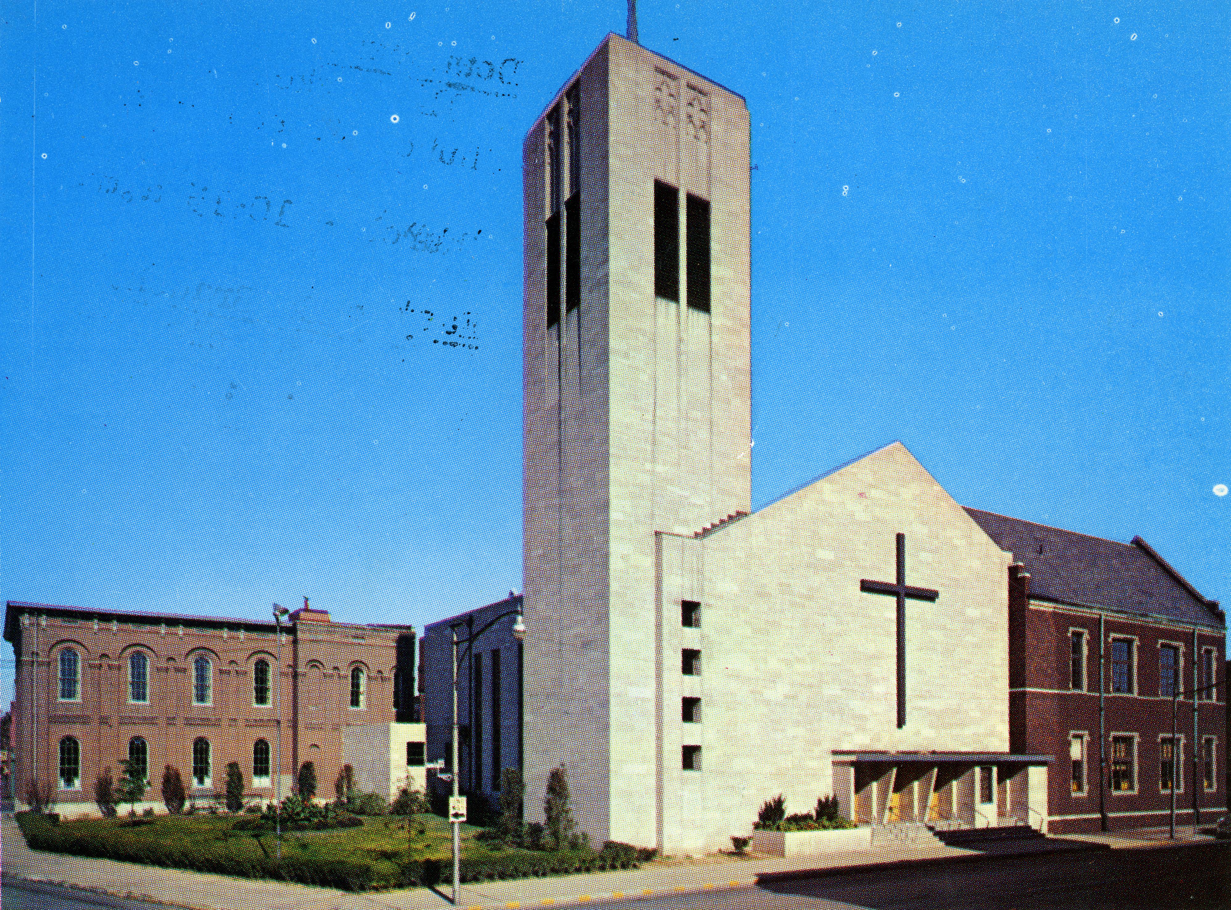 St. John's Evangelical Protestant Church at 321 NW 3rd St. It was organized in 1850, the original structure built in 1852, with a parish hall added in 1923. A 1950-1951 remodel/rebuild drastically changed the look of this church; what is seen here is the remodel. See RH 033-121-123 for the look of the original. Today this building houses City Church, which gives its address as 314 Market St. The structure seen on the left has changed, now only one story and concrete block.
