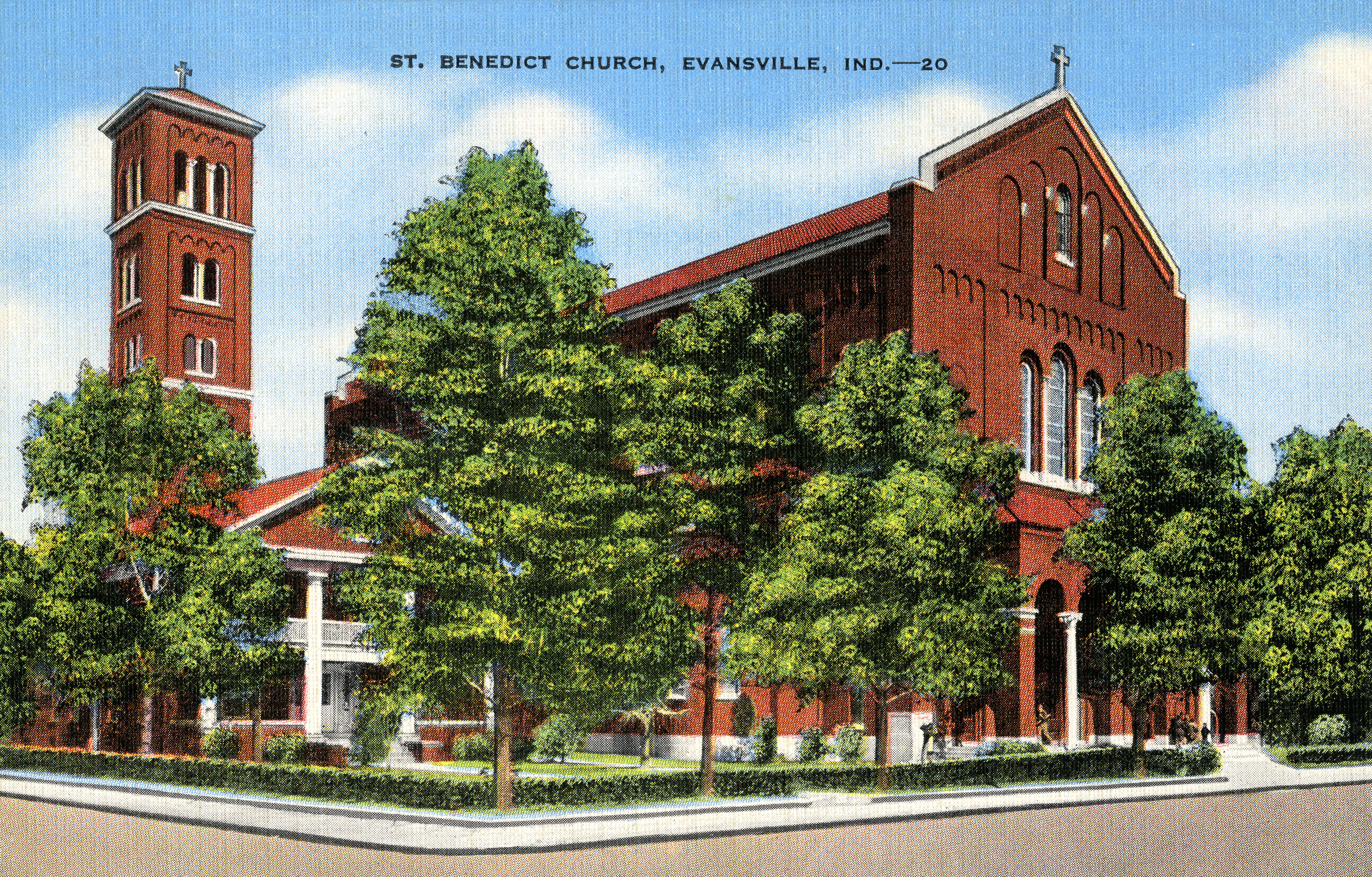 St. Benedict Catholic Church at 1328 Lincoln Ave. St. Benedict Parish was established in 1912 on the far east side of Evansville. The pastoral care for the parish was given to Benedictine Monks from St. Meinrad Abbey from the beginning. The founding families set out immediately to gather on Sundays for Mass and to provide for the education of their children, guided by the efforts of the Benedictine Sisters of Ferdinand. In 1913, construction was begun on a building that would house almost all the functions of the parish: a church, classrooms, housing for the Sisters, and a cafeteria. We now call this building St. Meinrad Hall. In short order, the founding pastor, Father Martin Hoppenjans, OSB, led the community in putting up a convent and a rectory. The present church building was completed in 1928 in the Lombard-Basilica style. It was dedicated March 18, 1928, by Abbot Athanasius Schmidt, OSB. The cathedral features ceilings that are 65 feet high, a baldachin over the altar and a seating capacity of over 900 people. A second school building, St. Scholastica Hall, including an auditorium, cafeteria, and gymnasium, was completed in 1953. The most recent construction, St. Benedict Hall, was completed in 2004 and houses offices, classrooms, and parish meeting rooms. The church was renovated after the liturgical reforms of the Second Vatican Council. The baldachin was moved forward about 25 feet and the former high altar was dismantled and the new altar was created. Two of Evansville�s bishops were ordained and installed in St. Benedict�s before it became a cathedral; Francis R. Shea in 1970 and Gerald A. Gettelfinger on April 11, 1989. On October 21, 1944, Pope Pius XII established the Diocese of Evansville. Assumption Church, Evansville�s oldest Catholic parish, was chosen as the first cathedral. The property was sold to the city of Evansville who demolished it in 1965 for the new civic center. Holy Trinity, Evansville�s second oldest parish, served as the Pro-cathedral from 1965 to April 11, 1999, when St. Benedict�s was consecrated as the third cathedral for the Evansville Diocese. (https://www.saintbenedictcathedral.org/about-us/)