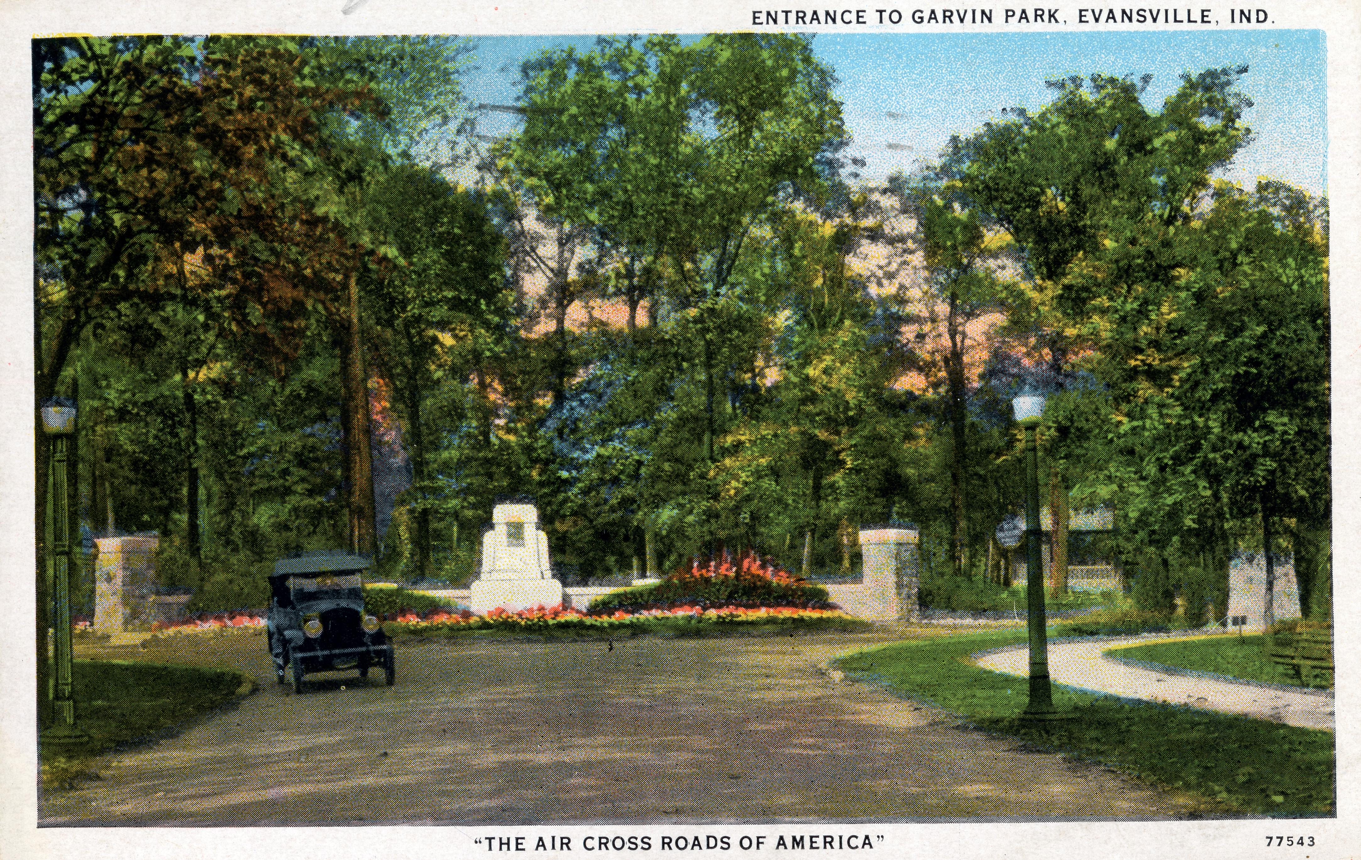 At the north end of Main Street was a wooded area owned by Thomas E. Garvin, a prominent Evansville attorney. First known as Garvin's Grove, it was open to the public and served as a retreat away from the city. In 1915, the land was given to the park system, thus establishing Garvin Park. Municipal parks received high priprity under Mayor Benjamin Bosse, and probably none more than Garvin Park. The park was laid out by a former student of Frederick Law Olmsted (who designed Central Park in New York City). The lake was built to remedy flooding from nearby Pigeon Creek. An entry gate and the electric fountain [seen here] were added shortly after the park opened. In the 1930s, architect Harry E. Boyle designed a bandstand and picnic shelter for the park. Amenities such as a pool, tennis courts, and playground equipment were added later. (Engler, Joe. Evansville. (Postcard History Series). Charleston, SC: Arcadia Publishing, 2012, p. 121-122)