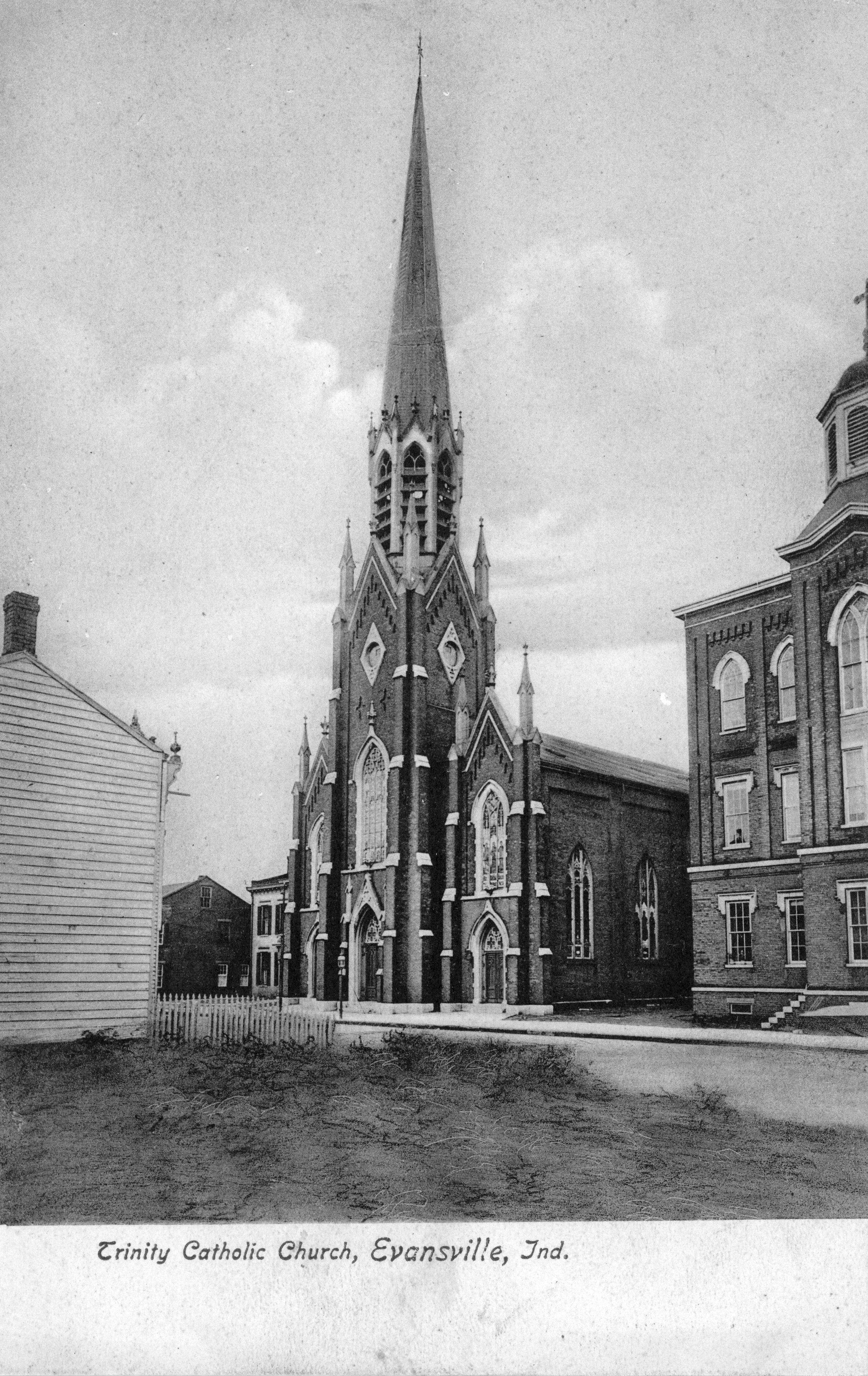 Trinity Catholic School and Church at 211 NW 3rd St., originally 12-16 Upper 3rd St. Holy Trinity Catholic church, an unimposing little church downtown on 3rd St, has the distinction of being Evansville's oldest Catholic parish. Originally the second oldest, it took that title from Assumption Church when it was torn down in 1965 for the Civic Center. But what most people may remember was the beautiful old church building that burned down in 1950. With the boom of German immigrants into Evansville, Holy Trinity was the result of the need for a German-speaking parish (Assumption was English-speaking). The cornerstone was laid in 1849, but a cholera epidemic halted construction. The church was finally completed in 1851 and Holy Trinity parish was born. The church occupied the entire half block of Third St between Court St (originally Division St) and Vine St. The gorgeous chuch with its tall spire was a downtown landmark. A huge school building was on the corner of Vine which for a time served as the Catholic high school (before Memorial was built). A sister's home was located behind the school fronting Vine St. A new rectory was built in 1912 on the corner of 3rd and Court which is still standing but hidden by the later addition of the education building. Sadly, after standing for a century the church was struck by lightning Easter Sunday and burned down April 3, 1950. The blaze completely gutted the church. Downtown lost one of its most prominent churches, and the city skyline was noticeably missing something. Mass was temporarily held in the school while the present Holy Trinity church was being built. When it burned, it was the oldest Catholic church in the city. While Trinity is still the oldest congregation, St Mary Catholic Church, built 1867, is now the oldest Catholic church building in town.