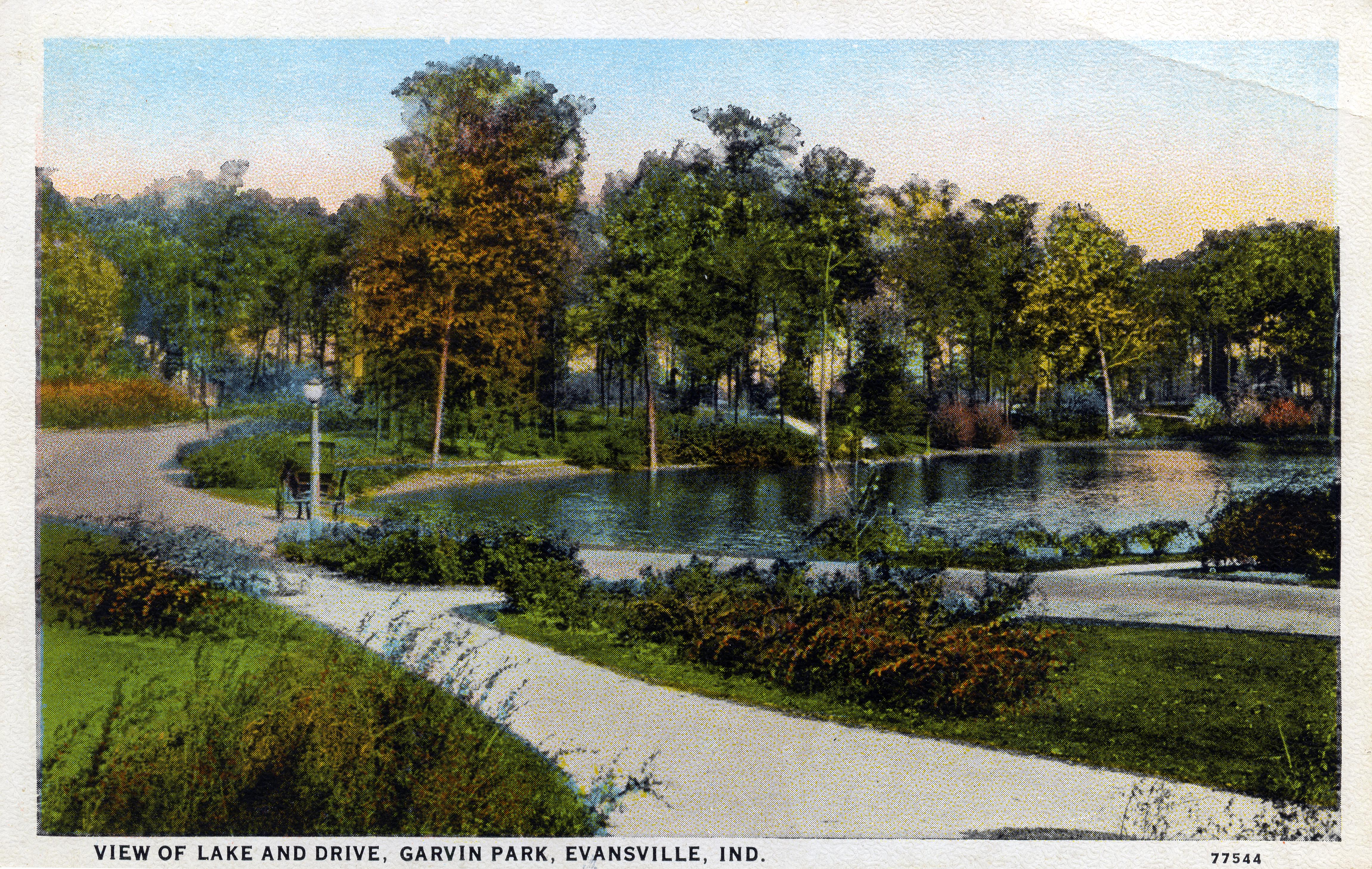At the north end of Main Street was a wooded area owned by Thomas E. Garvin, a prominent Evansville attorney. First known as Garvin's Grove, it was open to the public and served as a retreat away from the city. In 1915, the land was given to the park system, thus establishing Garvin Park. Municipal parks received high priprity under Mayor Benjamin Bosse, and probably none more than Garvin Park. The park was laid out by a former student of Frederick Law Olmsted (who designed Central Park in New York City). The lake was built to remedy flooding from nearby Pigeon Creek. An entry gate and the electric fountain [seen here] were added shortly after the park opened. In the 1930s, architect Harry E. Boyle designed a bandstand and picnic shelter for the park. Amenities such as a pool, tennis courts, and playground equipment were added later. (Engler, Joe. Evansville. (Postcard History Series). Charleston, SC: Arcadia Publishing, 2012, p. 121-122)