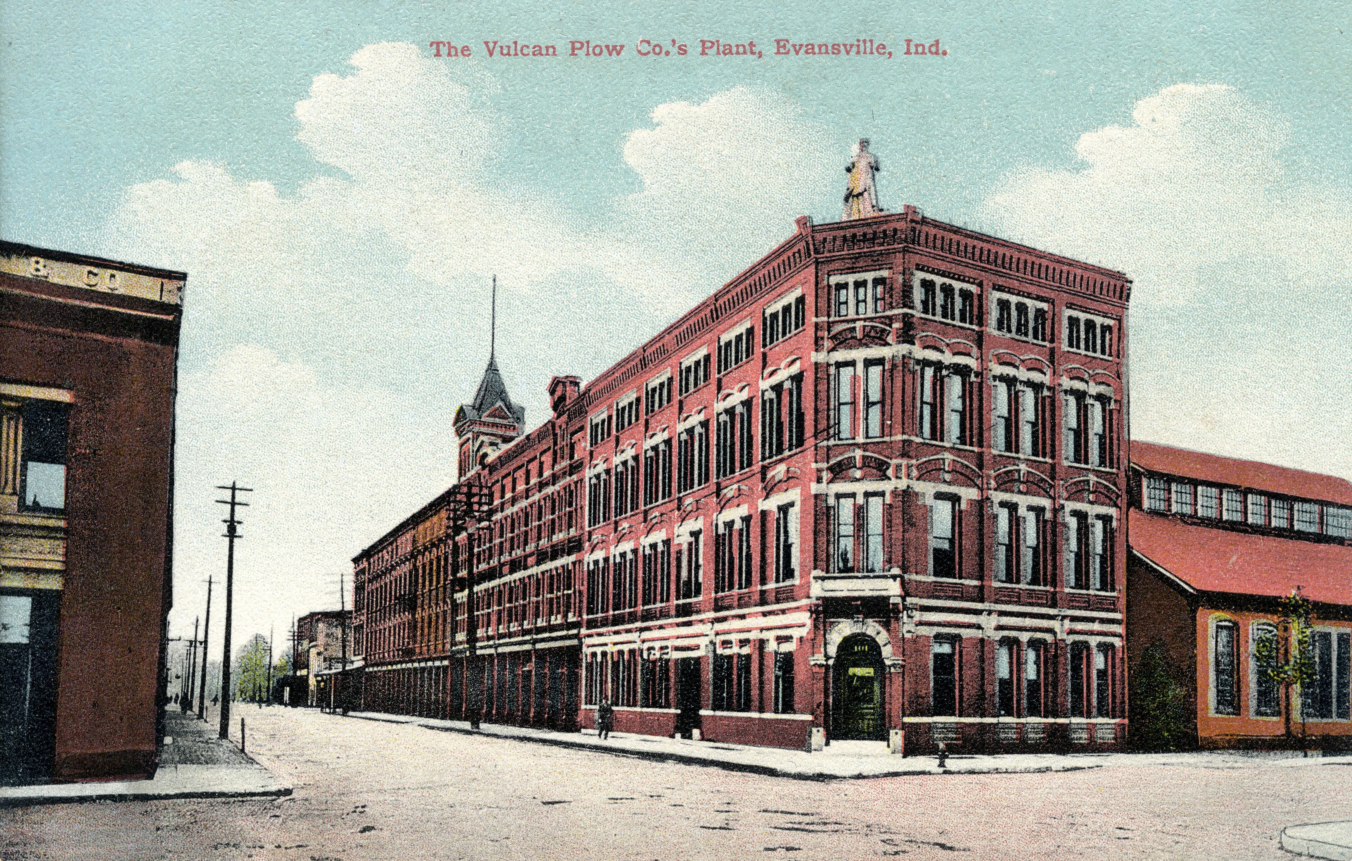 The Vulcan Plow Co.'s at 101 1st St., formerly 101-27 Lower 1st St. This postcard contains a hand-written note: Wish you good luck with Vulcan line in future. Am sorry that I will be unable to get up to see you again. H. B. Kinchel. (His obituary says Henry B. Kinchel was the credit manager for Vulcan Plow for many years.) The City Foundry was formed by William Heilman and his brother in-law, Christian Katz, in 1847, with the name changed to Vulcan Plow Works after the death of Heilman in 1890. This building was razed in 1957 with only a small portion in the rear remaining. The statue of Vulcan seen atop the front corner is now housed at the Evansville Museum.