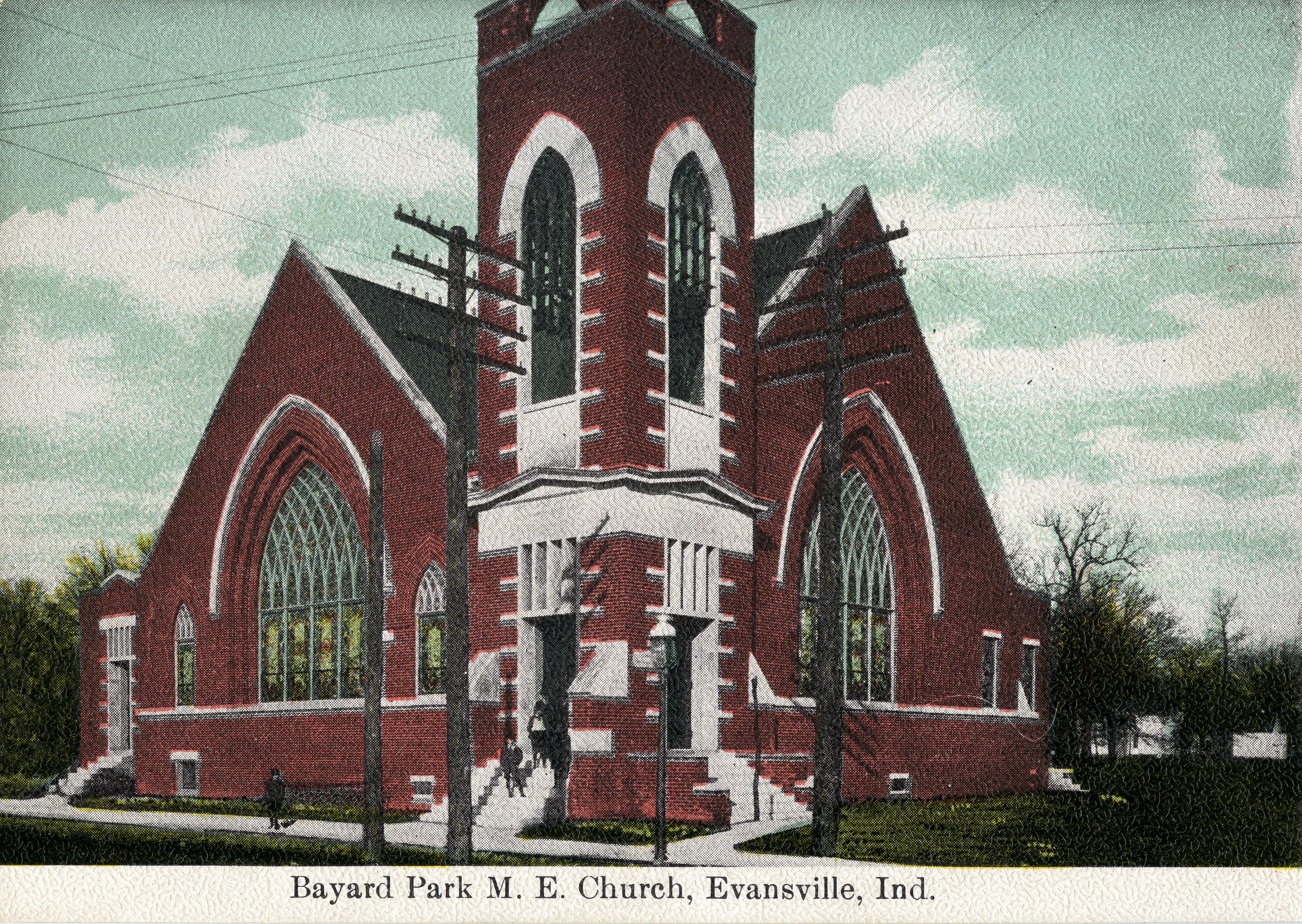 Bayard Park Methodist Episcopal Church at Blackford Ave. and Evans Ave. The Bayard Park Methodist Church had been organized by leaders of Trinity Methodist in 1906. Ground was broken for the church building at Blackford and Evans Avenues on September 16, 1908, with the cornerstone laying ceremony in October of that year. The Bayard Park Methodist Church was dedicated on February 21, 1909. In the year 1843, a group of German Methodists held their first meetings in a public inn. Explanatory notes accompanying records of that group advise that the inn-keeper was converted and became one of the fifteen charter members. In 1844, the first real church for this group was built on Vine Street, the site the same as the old fire station building across the alley from the Courier and Press building. This German Methodist congregation grew in number and influence and purchased a lot at the corner of Fourth and Vine Streets in 1865. A church and parsonage were built on this lot at a cost of $37,624.00. It was known as the Fourth Street M. E. Church and furnished religious inspiration for the congregation until the comparatively recent year 1937. At that time, County officials advised the Official Board and Trustees that the County wanted to buy the buildings to make them an annex to the County Courthouse. Since the location had become an almost entirely business area, and since membership and influence had been declining somewhat, it was the decision of the church authorities to sell, at a price of $46,000.00. Final services for the Fourth Street M. E. Church were conducted on Palm Sunday, March 21, 1937. A merger agreement had been reached between the membership of the Fourth Street M. E. Church and the Bayard Park Methodist Church at the time the decision was made to give up the Fourth Street location. The purpose of the merger of these two churches in 1937 was to build a new church on a site further east in the city than the Bayard Park Church occupied at the time. The years of World War II delayed the plans as expressed at the time of the merger, until ground was broken for the present Methodist Temple on January 13, 1949. The cornerstone of the Methodist Temple was laid on Sunday afternoon, March 20, 1949. The first service in the present Sanctuary was held on Sunday morning, July 2, 1950, with 800 people present. (http://www.methodisttemple.church/contentpages/42167/edc41350-782f-4c4f-a144-36cb8c390b6f/OurHistory.aspx) Today the building seen here is occupied by Mt. Zion Baptist Church.