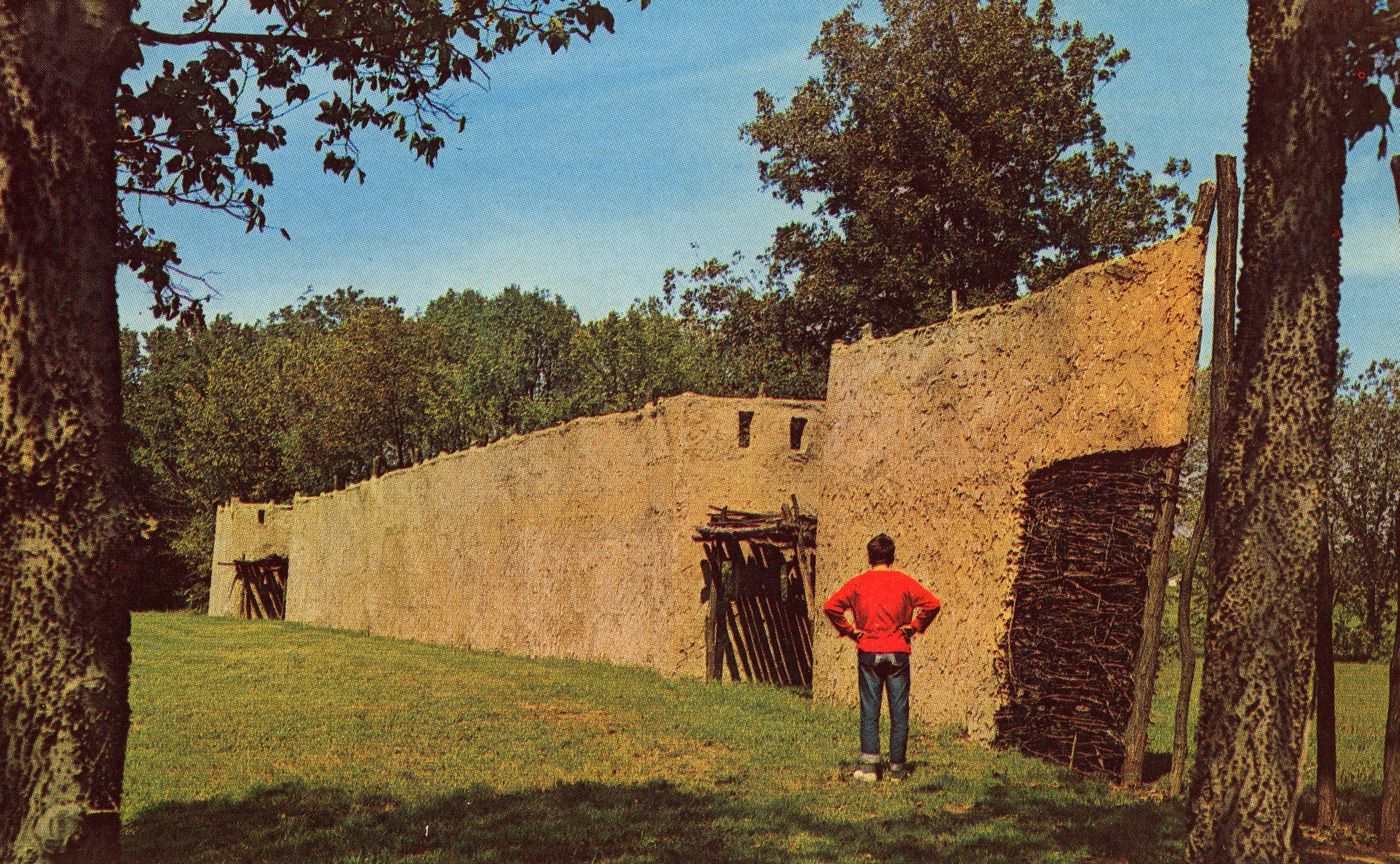 Angel Mounds State Historic Site at 8215 Pollack Ave. According to the back of the postcard, this palisade was reconstructed by the Indiana Historical Society, originally built by Indians of the Mississippian culture againse those of the Woodland culture. Angel Mounds is the site of the largest settlement of its time in what is now known as Indiana. It was a fortified town serving as a social, political, and religious center for a much larger area of villages, hamlets, and farmsteads that ran 70 miles along the Ohio River, from the Wabash River to 35 miles east of Evansville. The town and surrounding settlements together constituted a chiefdom and were occupied from as early as A.D. 1000 to as late as A.D. 1450 by Native Americans whom archaeologists call Mississippians. The term Mississippian refers to an Indian culture, or way of life, which developed in the Mississippi River Valley about A.D. 800 and spread, with regional variations, across the southeastern United States to the Atlantic and Gulf coasts. This culture was characteristic of many different groups who spoke a variety of languages. We have no way of knowing what language the people who lived here spoke, what they called themselves, or what they called the town they built here. The town became known as Angel Mounds because it was part of a farm owned by the Angel family for over 100 years. To preserve Angel Mounds, the Indiana Historical Society bought 412 acres of the site in 1938 with money donated by Eli Lilly. In 1946, the Historical Society gave the property to the State of Indiana and in 1965 granted the excavation rights to Indiana University along with the responsibility to house the artifacts. The original purchase was augmented by Elda Clayton Patton Herts' donation of 20 acres containing an early Woodland mound. This mound lies across from the entrance to Angel Mounds State Historic Site on the north side of Pollack Avenue. From 1939 to 1942, the United States Works Progress Administration workers, under the direction of Glenn A. Black, conducted scientific excavations. In 1945, Indiana University began archaeological research at the site, work which continues to expand our understanding of the people who lived here. (http://www.angelmounds.org/about-us-2/angel-mounds/)