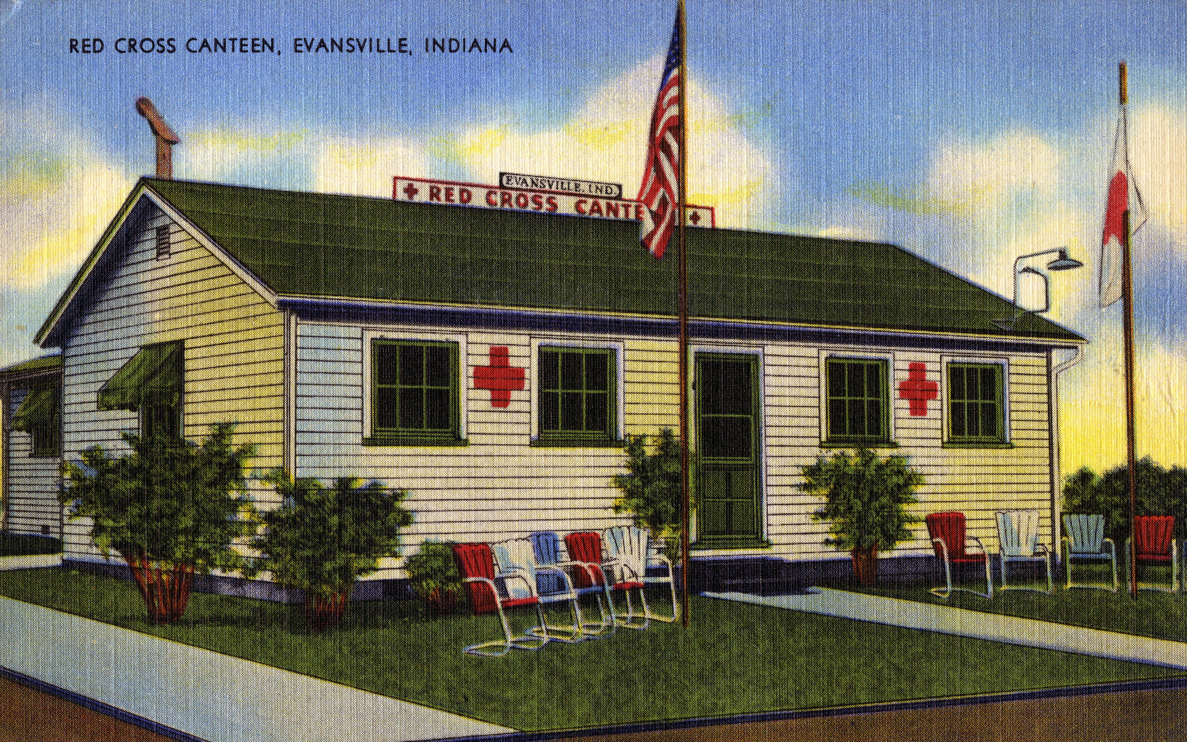The Canteen was located at the intersection of Ohio Street and Fulton Avenue, next door to the L and N Railroad Depot. This small wood frame building served 1,612,000 service men and women. The Canteen operated only 3 years, averaging about 1,280 meals per day. The amazing fact is that no money was collected from any serviceman. All costs were provided for by the area citizens and the American Red Cross. All Canteen workers were volunteers, they numbered in the hundreds and for many this was their full time job. In June 1942 the land was loaned by Southern Indiana Gas and Electric Co. The building was built by the Evansville Courier and the Evansville Press. The 20 by 35 foot building was completed in two weeks and placed in service on June 14, 1942. Here are a few facts to clarify the situation; the usual mode of transportation was by railroad. America had about 11,000,000 men and women under arms. An inductee would ride to training base by rail; go home for leave by rail. Then perhaps to a special training camp, home again and then to a permanent duty station, all via the railroads. The usual military train did not have a diner car. Sometime, when the train had many civilian passengers, a dining car would be attached. The boys, however, often did not have money to pay for food. Some stories were distressing. One young man, Pvt. Taylor, said he had been standing on a train for 48 hours and often the troops said that they had not eaten for a day. It appears that the army and navy put the men on a train and provided water and toilets and nothing else. There may have been no dining provisions for them along the tracks. Some canteens charged for food. Remember, the main thing was to win the war. Everything else was in second place. At any one time, there would have been many thousands of troops in the rail system. Evansville averaged 1,500 men and women per day during 1943 when more than 500,000 persons stopped for a meal, a drink and a chance to stretch their legs. The Canteen received a constant flow of food, service and money contributions from a radius of about 50 miles around Evansville. The towns in Illinois, Kentucky and Indiana took the Canteen on as their responsibility; they kept it very well supplied with what they could offer. The Evansville Courier gave a daily summary of goods and supplies that were donated. The gifts may have been a 4-H club prize beef, an entire crop, a live animal (prepared by an area packing house), canned goods, fresh produce, pies, cakes, tobacco products, coal for winter heat, cash, postage etc. One family donated 1,000 post cards for the boys. Contributions would come from a small town, church groups, neighborhoods, a street, a city block, a store or a war plant. While the flow of goods was endless, one must wonder how the canteen staff could continually deal with goods of such variance and quantity. Often, the donations may have included, for instance, a jar of canned pickles, several dozen donuts, a bushel of unshelled beans, a ham or some chickens. Keep in mind that the building was not as large as a modern mobile home and it had little storage space and a tiny food preparation area. ... One night the women staffers were treated by 30 black sailors from the Great Lakes Naval Training Station. The young men sang Anchors Aweigh in appreciation for dinner. Often the Canteen had volunteer entertainment for the troops. The canteen women served as mothers or doctors to those in need, menders to those with rips and lost buttons. Perhaps the 2,100 soldiers having supper in a two hour time period was a record. Some days as many as 3,500 service men were accommodated. In 1943 5,000 Christmas packages were given to soldiers at the Camp Breckinridge hospital. At times, the service men were sleeping or could not leave the train, so the volunteers would always take food and drink to the train. Sixty-five wounded troops on a hospital train were served sandwiches, ice cream and cigarettes by the Red Cross women. The Red Cross had a multi-purpose mobile unit that collected large contributions, delivered food and drink to service men groups that may have had special problems or sick travelers that needed emergency aid at a hospital or physician. The Red Cross had a mobile canteen van that would go where there were large numbers of troops. In 1944 a small building was built between airplane hangers to serve as the Red Cross Airport Canteen for the many airmen that flew into and out of the busy Evansville Airport. They served around 100 meals per day. Praise and tributes were shared on many allied ships and bases by boys that were served while passing through Evansville. Fred Redman, a radio-gunner on a B-24 bomber made a special trip to Evansville to tell the Canteen volunteers how much he and the boys enjoyed the good food and fine treatment they had received at the canteen. When we talked about our hometowns nobody had ever heard of Epworth, Illinois, Redman said, but when I would say Epworth was 38 miles from Evansville, the guys started talking about the Evansville canteen. You would have been very pleased if you could have heard only a few of their stories about this canteen. Redman told the women that he had been stationed in England, Ireland, Scotland, Greenland, Iceland, France and Germany and in all those countries the Evansville canteen was well known by many of his buddies. The Canteen closed January 1, 1946. (http://web.usi.edu/boneyard/redcross.htm)