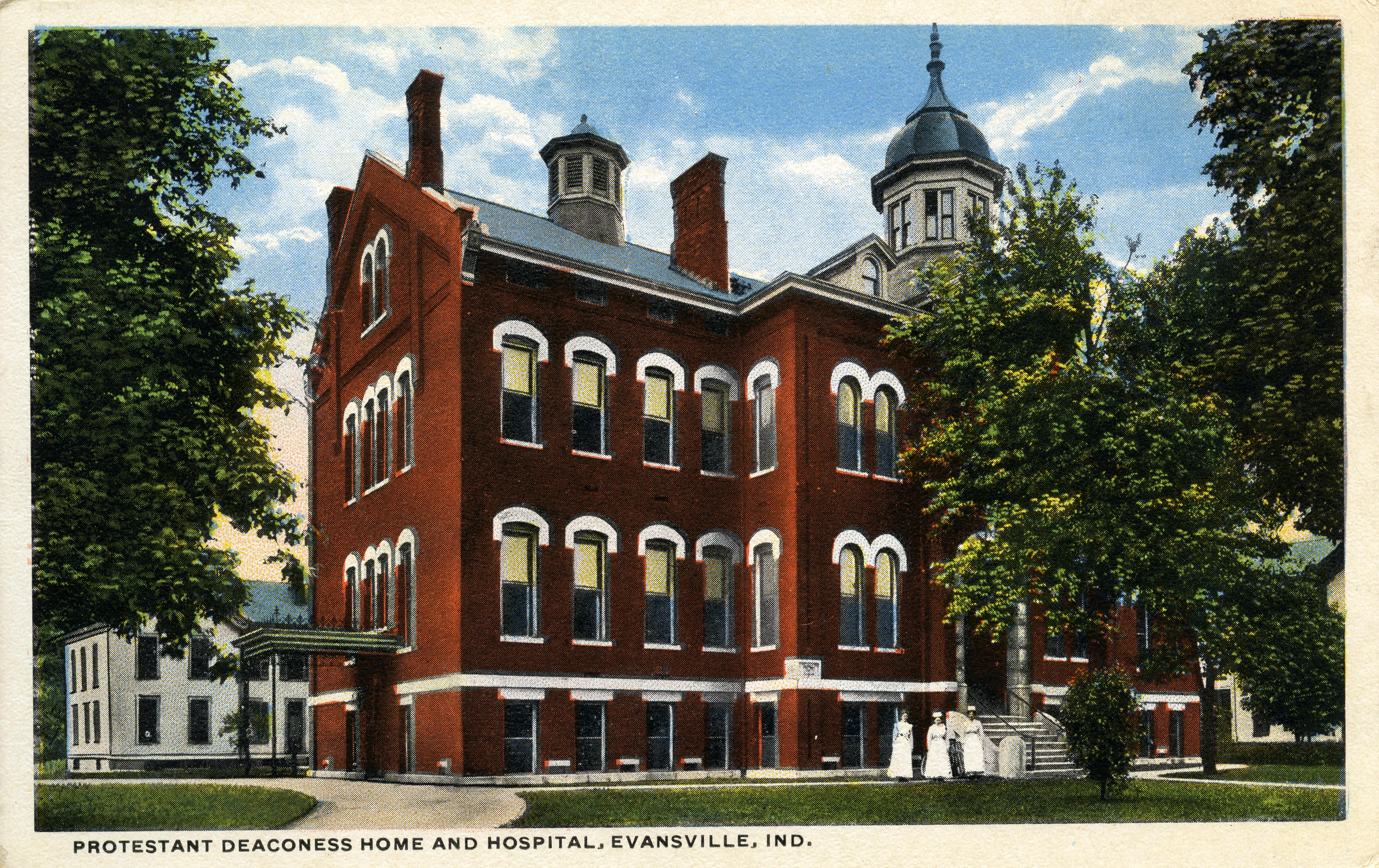 Protestant Deaconess Home Hospital at 604 Mary St., commonly called Deaconess. In 1893, the home of Major Byron Parsons, a Civil War veteran, at Mary and Iowa was converted into the first 19-bed hospital. In 1897 this was moved to the back of the lot and a new building was built. A three-story brick hospital was completed in 1899 and was celebrated as one of the most impressive Deaconess institutions in the country. The new Protestant Deaconess Hospital had beds for more than 60 patients. It boasted three operating rooms with hot and cold sterilized water and good lighting, so that operations could be performed with the same degree of safety day or night. (https://www.deaconess.com/About-Us/Our-History) Additions and changes occurred over the years, to the point that by 1948 every part of the original structure was subsumed and what is seen here was no longer visible or identifiable. In the early 1970s nearly all the original building was demolished to make room for a new facility, now covering some 20 city blocks.