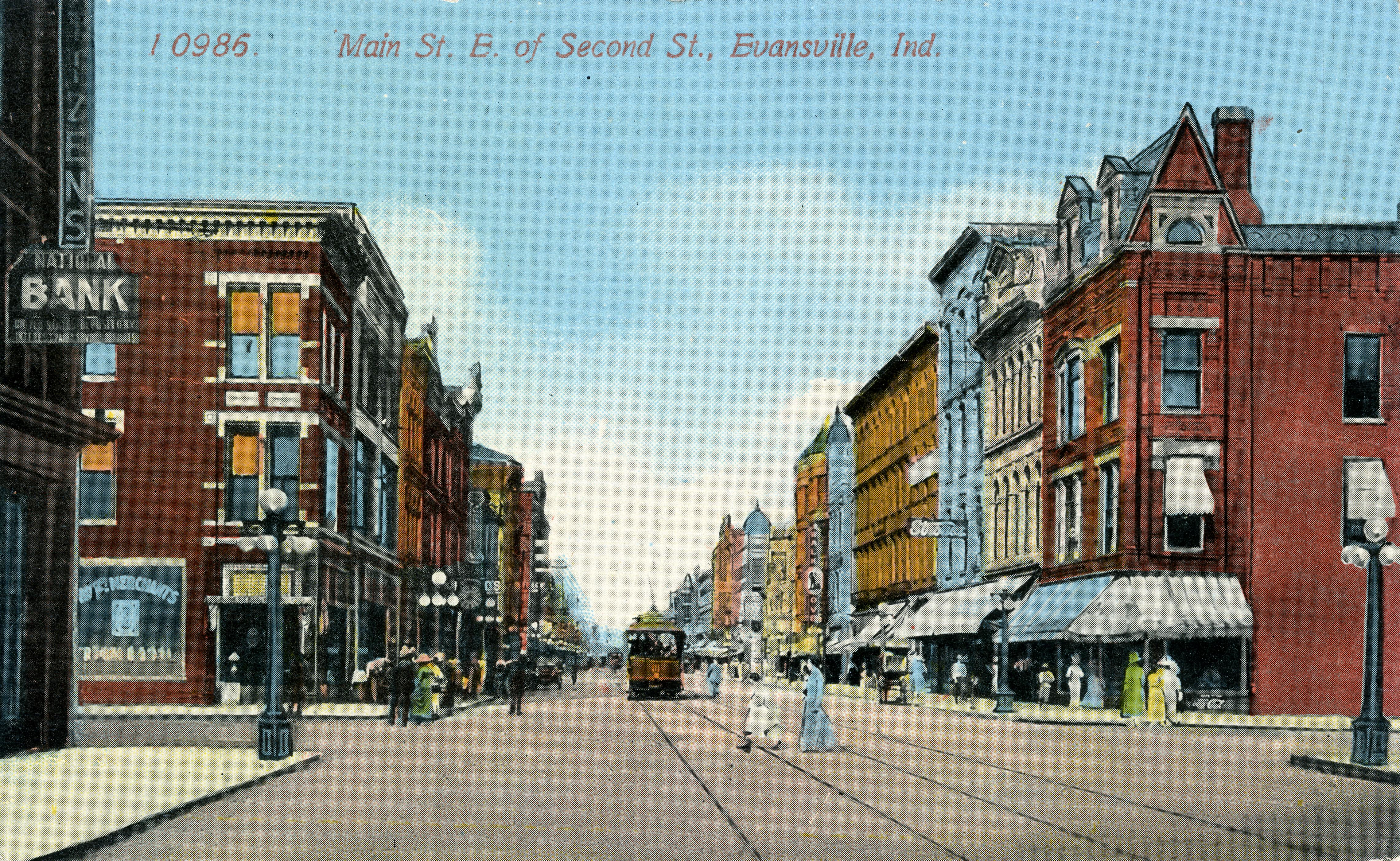 200 block of Main St. On the left, just barely visible, is Citizens National Bank at 130 Main St. The bank, which dates to 1874, moved to this location in 1884 and expanded in 1907, changing the fa�ade. It moved to another location in 1916 and this building was razed circa 1940. Across 2nd St. is the old Bitterman building at 200 Main St., in which the Bitterman brothers established a jewelry store in 1885. They moved next door, to 202-204 Main St., in 1923. Both building still stand, although the facade on the 202-204 address is entirely different. 200 Main looks much the same other than the ground floor facade. The large building on this side (yellowish, middle ground) is the Hughes Building/Eichel Block. It was built in 1892, reusing a portion of the foundation of the old courthouse (the 1852 one). It was damaged in a 1951 fire and partially torn down; it was razed in 1984. On the right is a sign for Strouse's, at 203-205 Main St. It was founded in 1868 by 7 brothers from Baltimore. The building seen here, along with two adjoining, burned in 1945, but the business reopened in 1948. For many years it was one of the premier men's clothing stores. It went out of business in 2009. About mid-way down on this side, the building with a turret, at 301-303 Main St., was once German National Bank and then at least 2 different business colleges. It still stands but has been drastically altered and the turret long gone.
