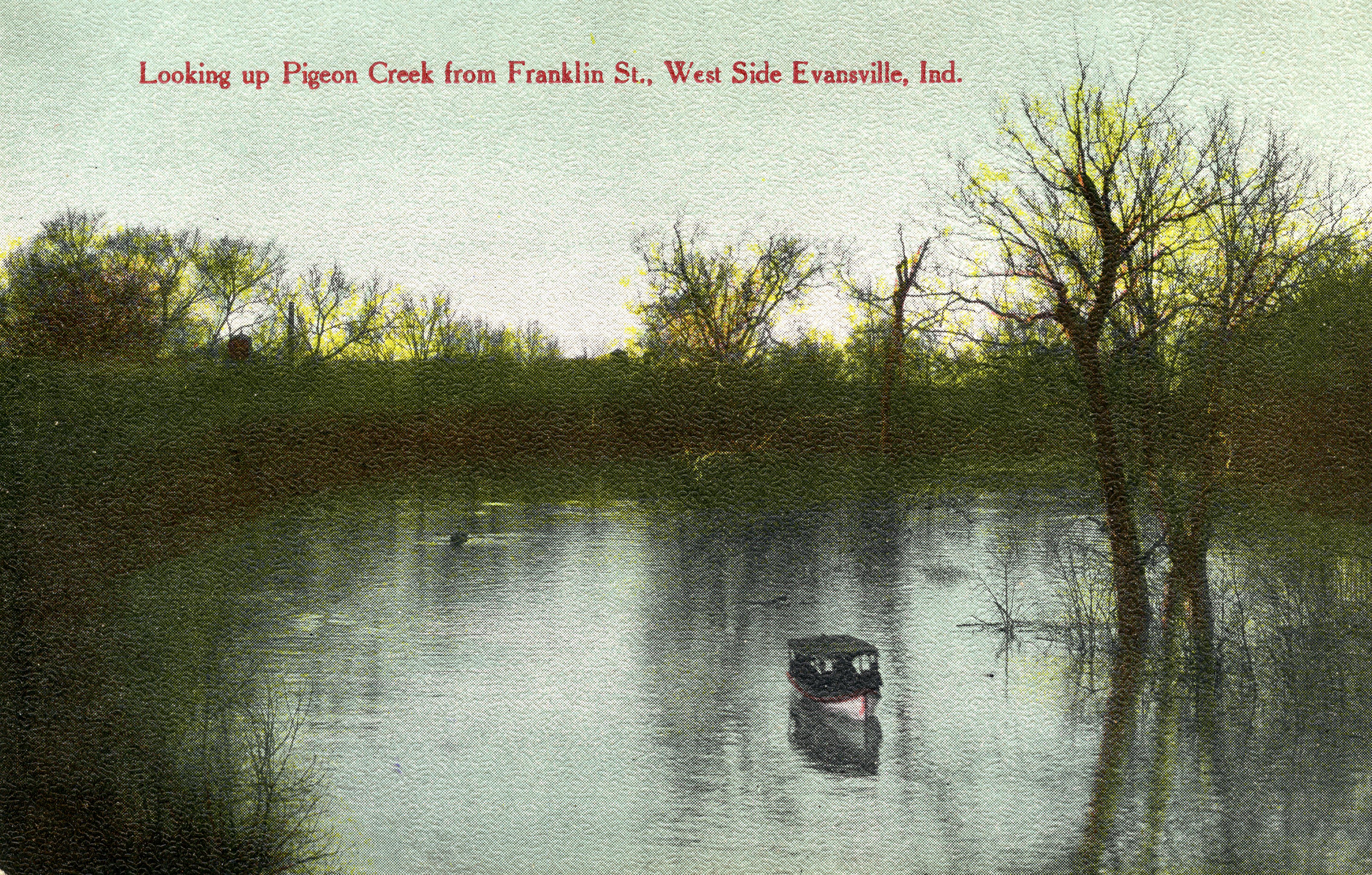 Pigeon Creek is a tributary of the Ohio River in southwestern Indiana. It runs approximately 47.5 miles (76.4 km) from its eastern source in rural Gibson County near Princeton and its western source near Owensville. The forks merge southeast of Fort Branch, and from there it heads southeast into Warrick County near Lynnville, from where it heads south. The larger creek then turns west crossing into Vanderburgh County under Interstate 69. The creek has a few more tributaries join as it first heads west through Evansville's East and North Sides then south through Downtown Evansville, where it empties into the Ohio River. (https://en.wikipedia.org/wiki/Pigeon_Creek_(Indiana))