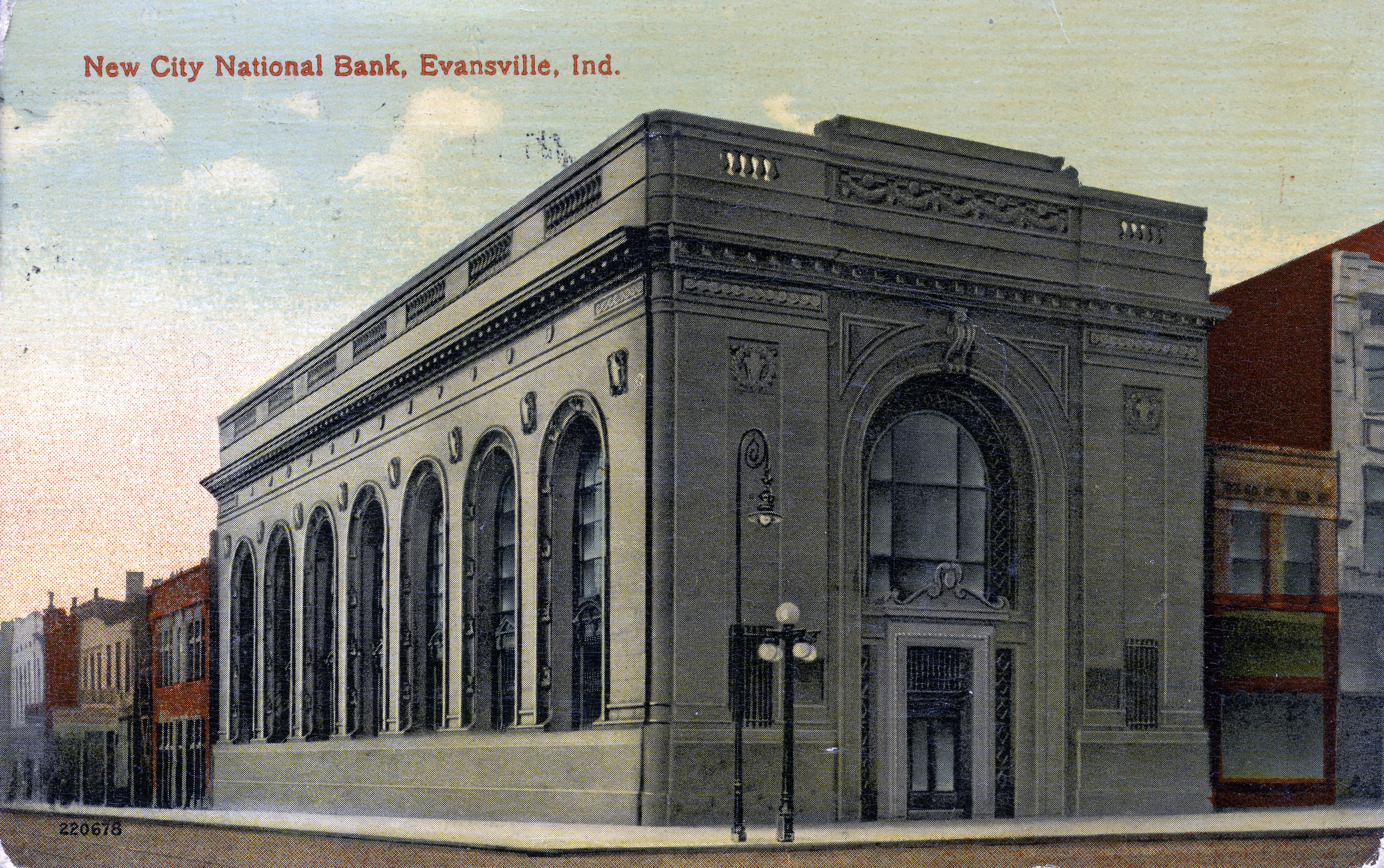 City National Bank at 227-229 Main St. Canal Bank was established in 1850 at 9 NW Riverside Dr., formerly 222? Upper Water St., and renamed First National Bank in 1863, and in 1866 moved again to 29-31 Main St. In 1902 the name was changed to City National Bank, which in 1914 moved to the location shown here. In 1922 it was renamed National City Bank and renamed again in 2000 as Integra. The building still stands, no longer housing any sort of financial institution.