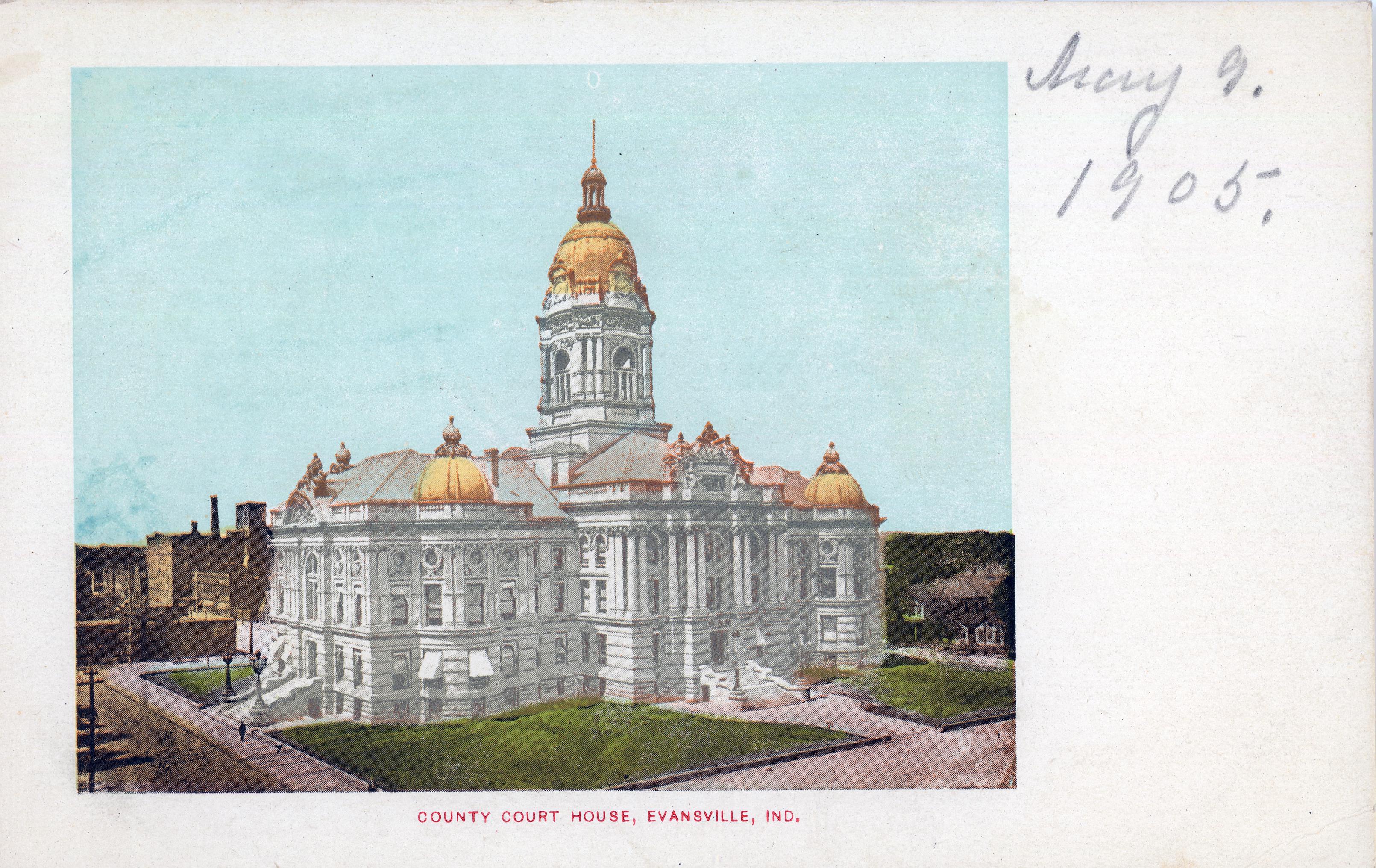 Vanderburgh County Courthouse at 201 NW 4th St. The Old Vanderburgh County Courthouse is considered by architectural historians to be one of the most important examples of 19th century governmental architecture in the country.. It was designed by Henry Wolters of Louisville, Kentucky and exemplifies Beaux Arts architecture which was just coming into vogue at the time of the Courthouse�s design, replacing heavier Victorian styles. Wolters himself studied at the Ecole de Beaux Arts in Paris. It occupies a full city block bound by Fourth, Vine, Fifth and Court streets in downtown Evansville which was once a turnaround basin for the Wabash and Erie Canal. Franz Engelsmann of Chicago is credited with carving the fourteen main statues that surround the courthouse. Much about the history of Vanderburgh County can be gleaned from the sculptures which were all carved onsite. The building is constructed of Bedford Stone, limestone native to Indiana, and the interior boasts marble floors, Ettewa pink marble wainscots, slate stairs and wrought iron and brass handrails. At its tallest point, 216 feet, the courthouse�s bell tower dominates the skyline of Downtown Evansville. Construction on the courthouse began in 1888 and was completed by 1890 at a cost of $379,450. County government personnel started moving into the courthouse in early 1891. The courthouse was the epicenter of community life and for the big events of its day. The Commissioners room served as the military headquarters during the 1937 flood when martial law was declared and the courthouse was a stop on the campaign trail for President Harry Truman in 1948 and John F. Kennedy in 1960. Both gave speeches from the courthouse steps. The building was vacated in 1969 when county government offices were moved to the new Civic Center Complex. (https://oldvanderburghcourthouse.com/about-the-old-courthouse/)