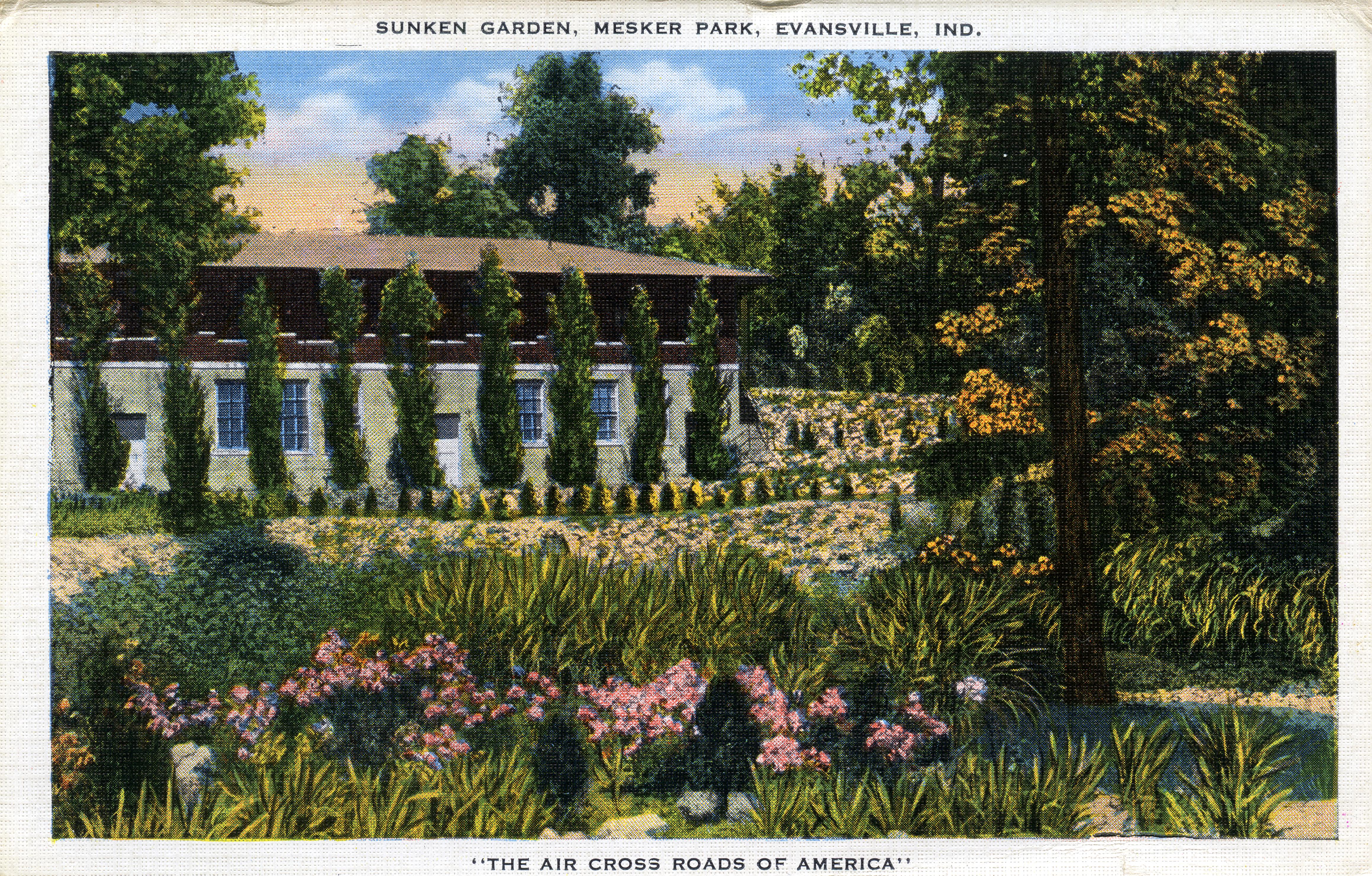 Postcard of a drawing of a sunken garden in Mesker Park, Evansville, Ind. The Air Cross Roads of America.