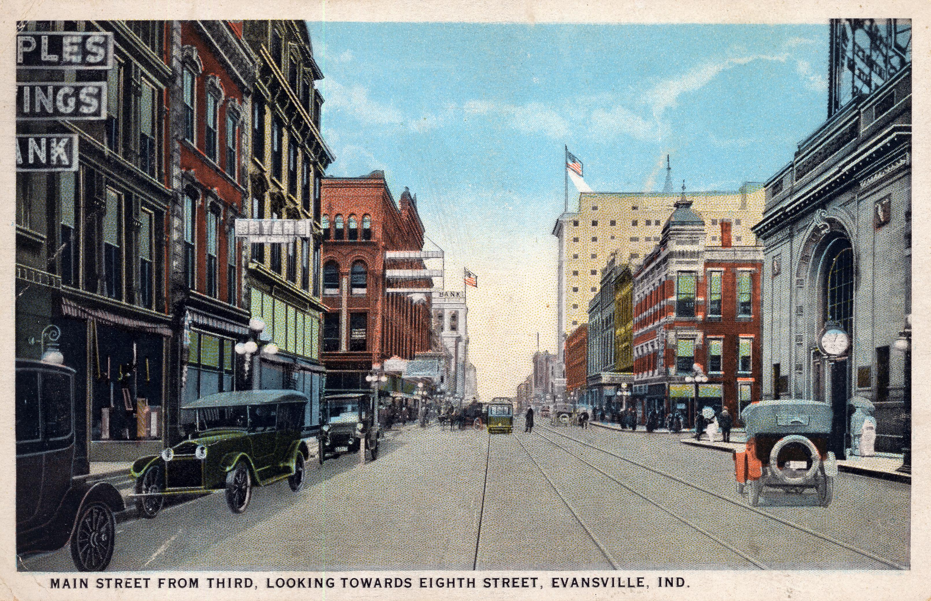 Main St. from 3rd St., looking towards 8th St. On the right is City National Bank, aka National City Bank at 227-229 Main St. The new City National Bank was built in 1913 at the corner 3rd and Main. It was built on the same spot as original courthouse which was torn down for the new bank. THe building was designed in the neoclassical style by Jennie and Mundie, architects from Chicago. The bank opened its doors Jan, 1 1914 after the bank moved from its previous location at 1st and Main. The bank was renamed in 1922 to National City Bank. Although no longer a bank, the contemporary facade looks much like this. The building with the turret, at 301-303 Main St., was once German National Bank and then at least 2 different business colleges. The tall building on this side is Citizens National Bank at 329-331 Main St. The bank was established in 1874, on 1st St., and moved to 130 Main St. in 1884 after consolidating with 2 other banks. In 1916 it moved into the building pictured here, Evansville's first skyscraper. The bank moved out in 1959 and the building later became known as the Hilliard Lyons building. The building still stands today, in good repair, although it no longer hosts any sort of financial institution. Across the street is the Hughes Building, a.k.a. the Eichel Block. The Hughes building was razed in 1984.