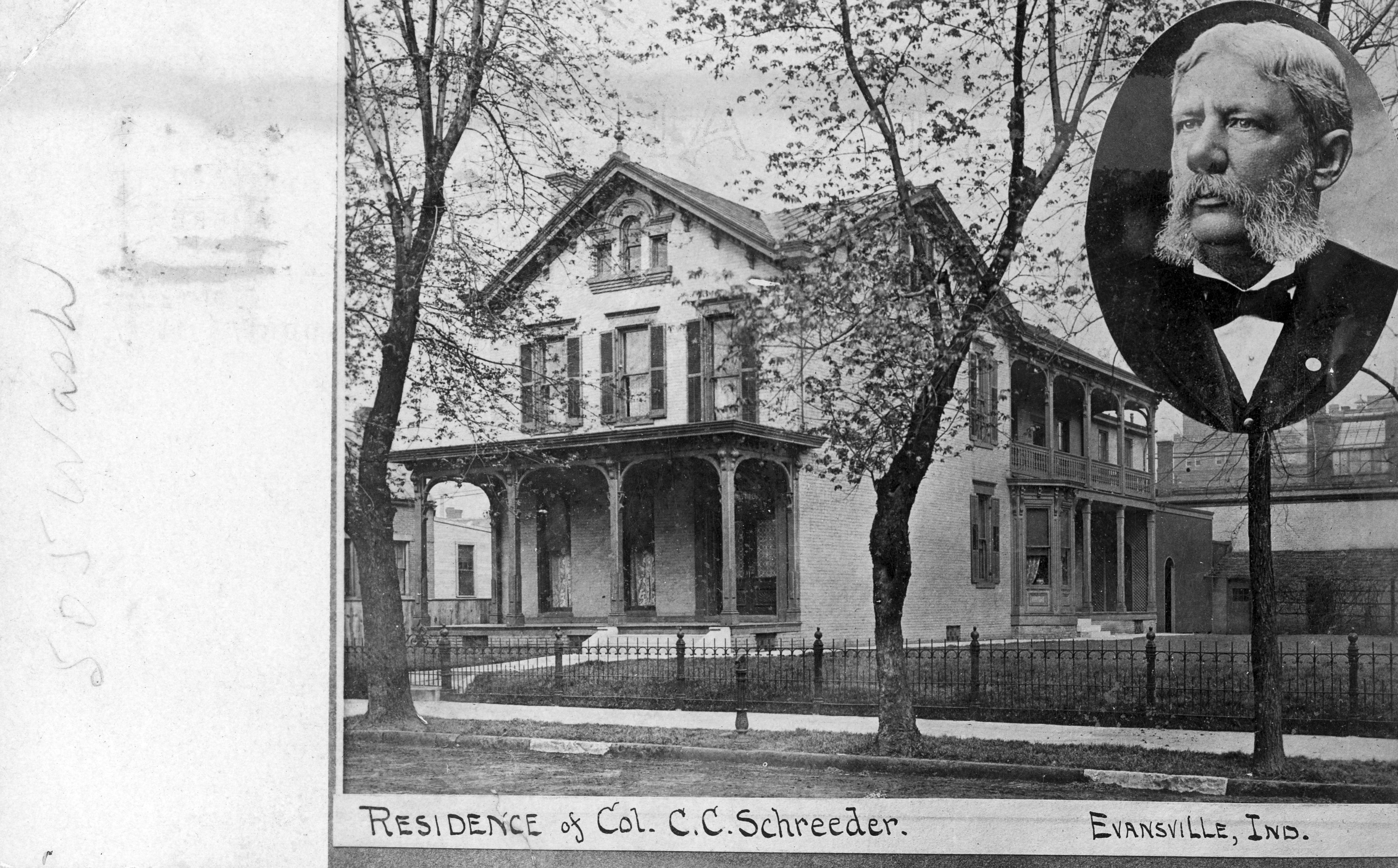 Residence of Col. C.C. Schreeder. At the time of his death in 1930, Col. Charles C. Schreeder (1847-1930) lived at 505 Washington Ave. A Google maps view in November 2018 shows a house on Washington Ave. at the corner with S. Elliott St. shows a house that has been remodeled but looks much like this. Schreeder was a local politician.