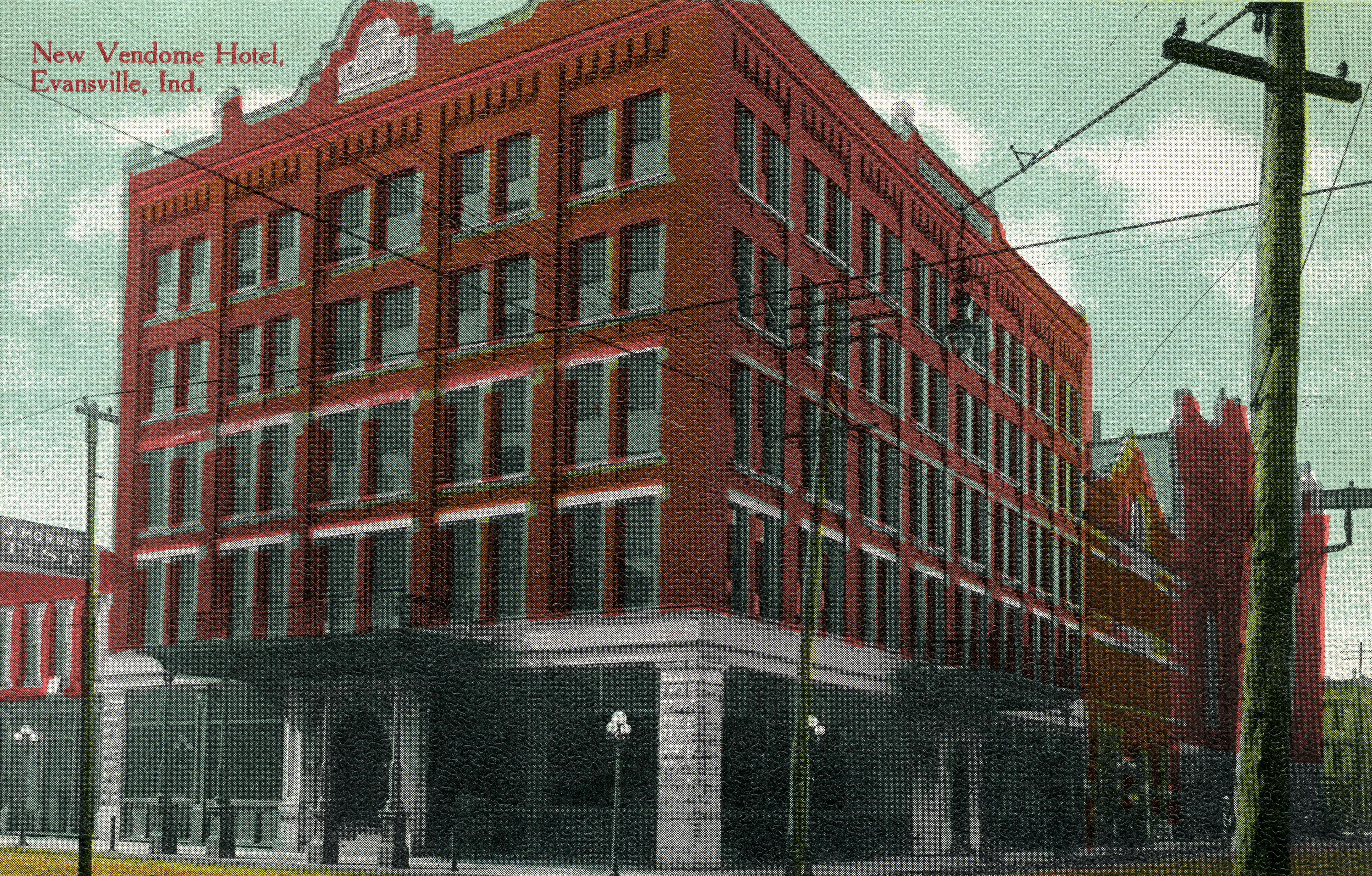 Vendome Hotel at 24-30 NW 3rd St., formerly 201-215 Upper 3rd St. The hotel was built in 1890; in 1906 it was purchased by Frederick J. Scholz and enlarged, and began to be referred to as the Vendome Hotel. The building ws razed in 1972, and Fifth Third Center now occupies this space. The president was Charles J. Scholz.