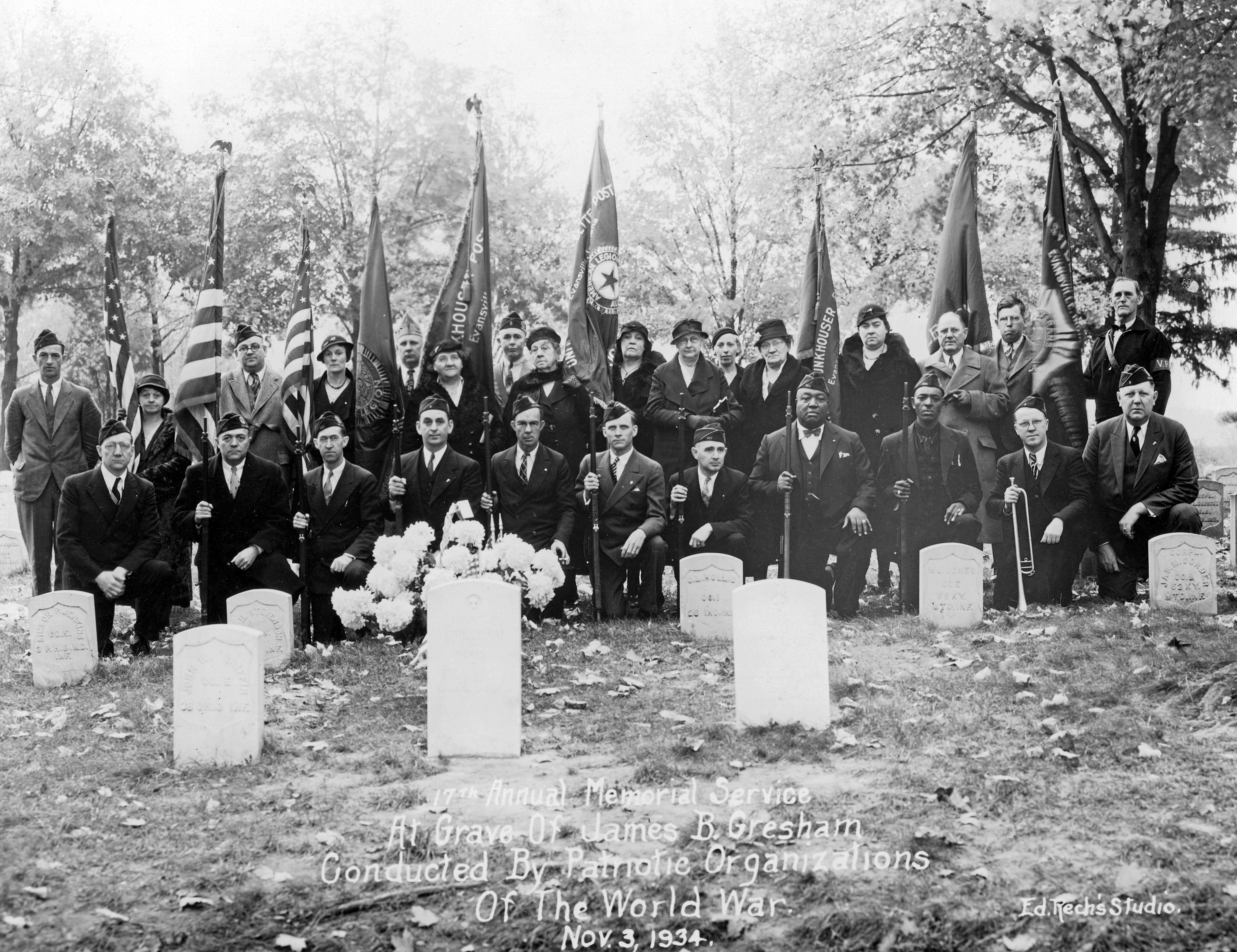 17th annual memorial service at grave of James B. Gresham, conducted by the patriotic organizations of the World War. James Bethel Gresham (August 23, 1893 - November 3, 1917) was one of the first three American soldiers to die in WWI. He was born in Kentucky, but moved with his family to Evansville in 1901, attended Centennial School, and worked in one of the furniture factories. He died in France and was originally buried there, but in 1921 was re-interred at Locust Hill Cemetary in Evansville. The cemetery is at 3800 Kratzville Rd.