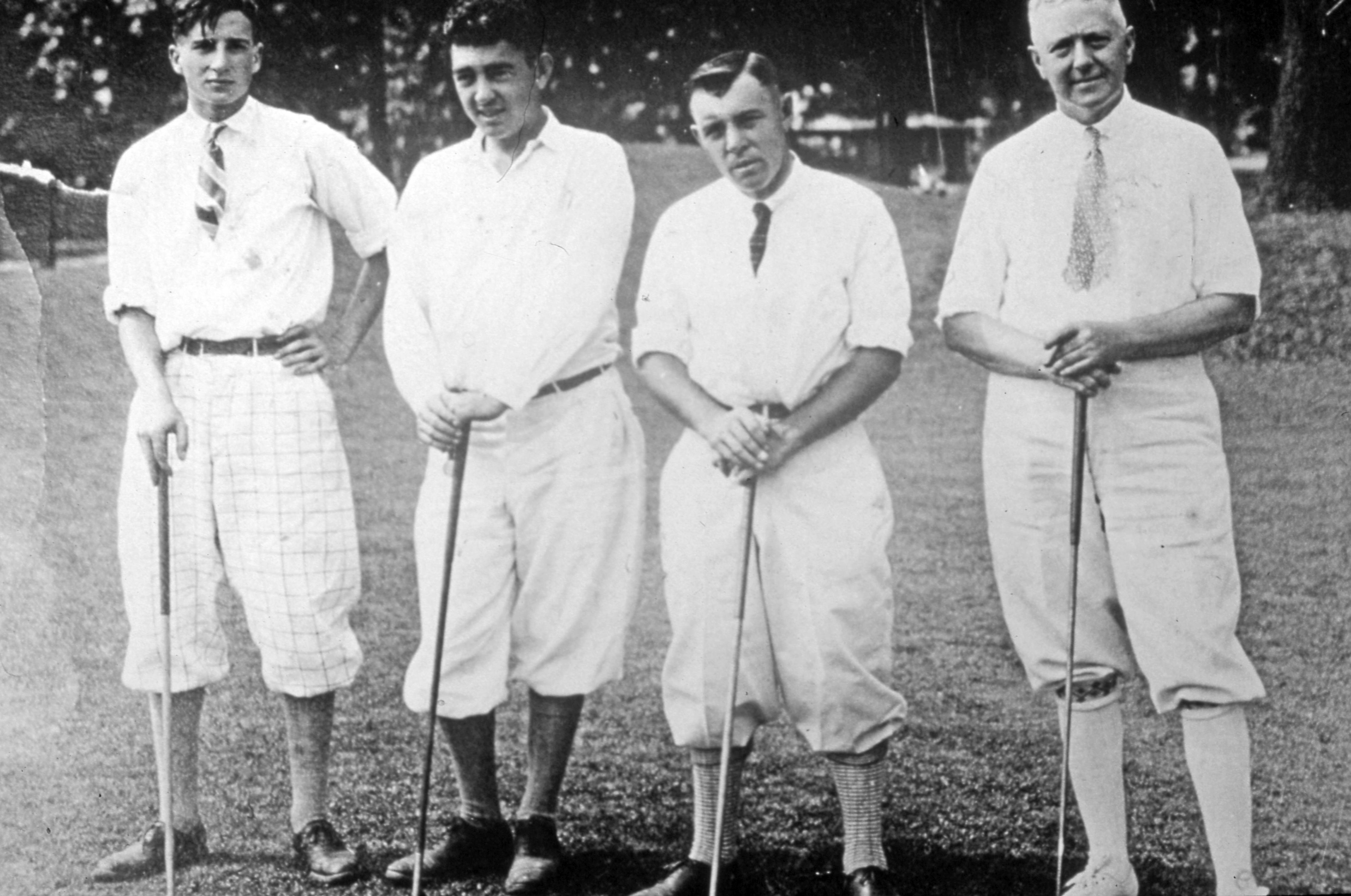 Four men with golf clubs, posing for a photo. The wearing of knickers probably places this in the 1920s.