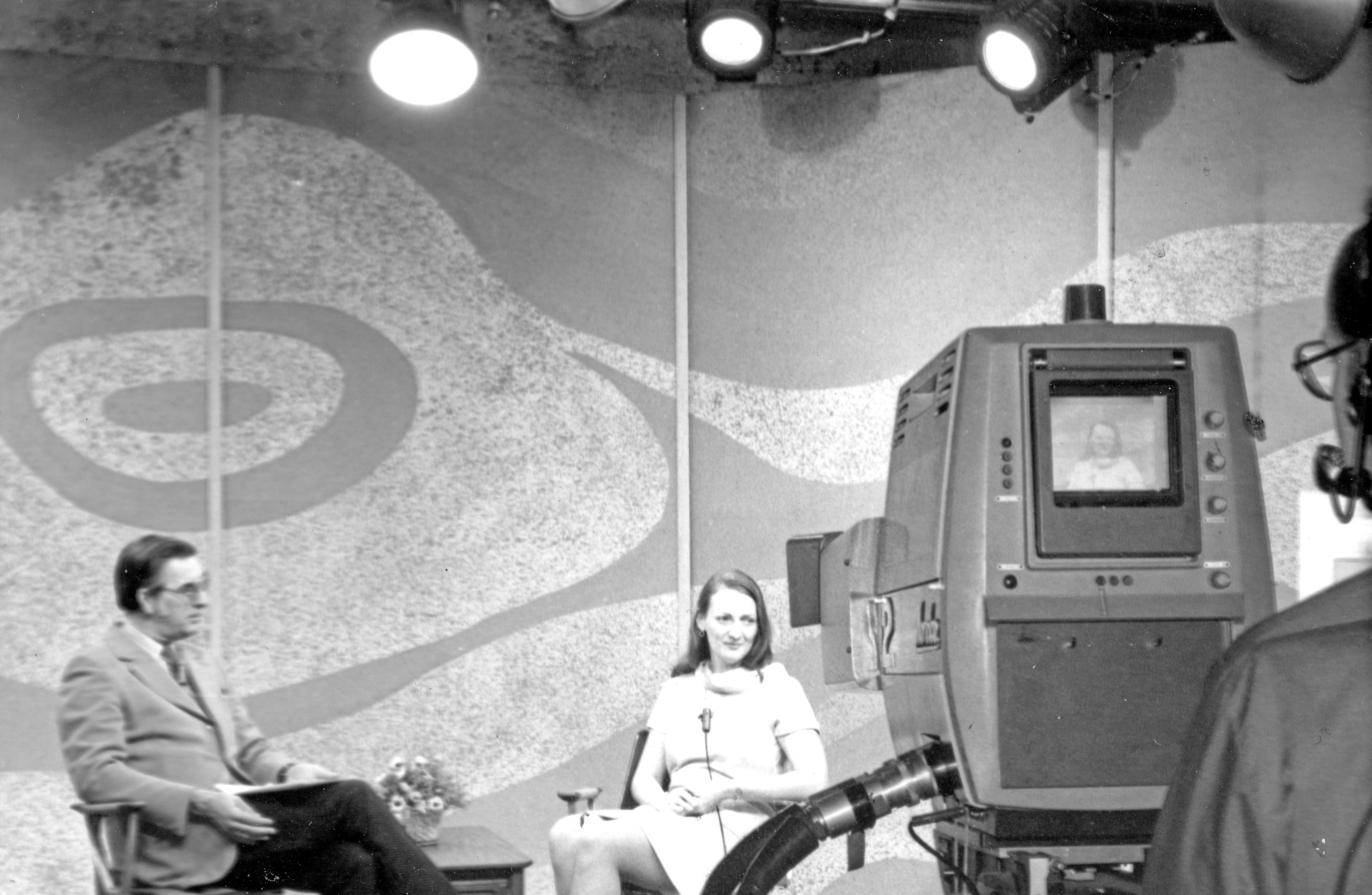 Marygale Hartzell on a televison set and her guest is unidentified.