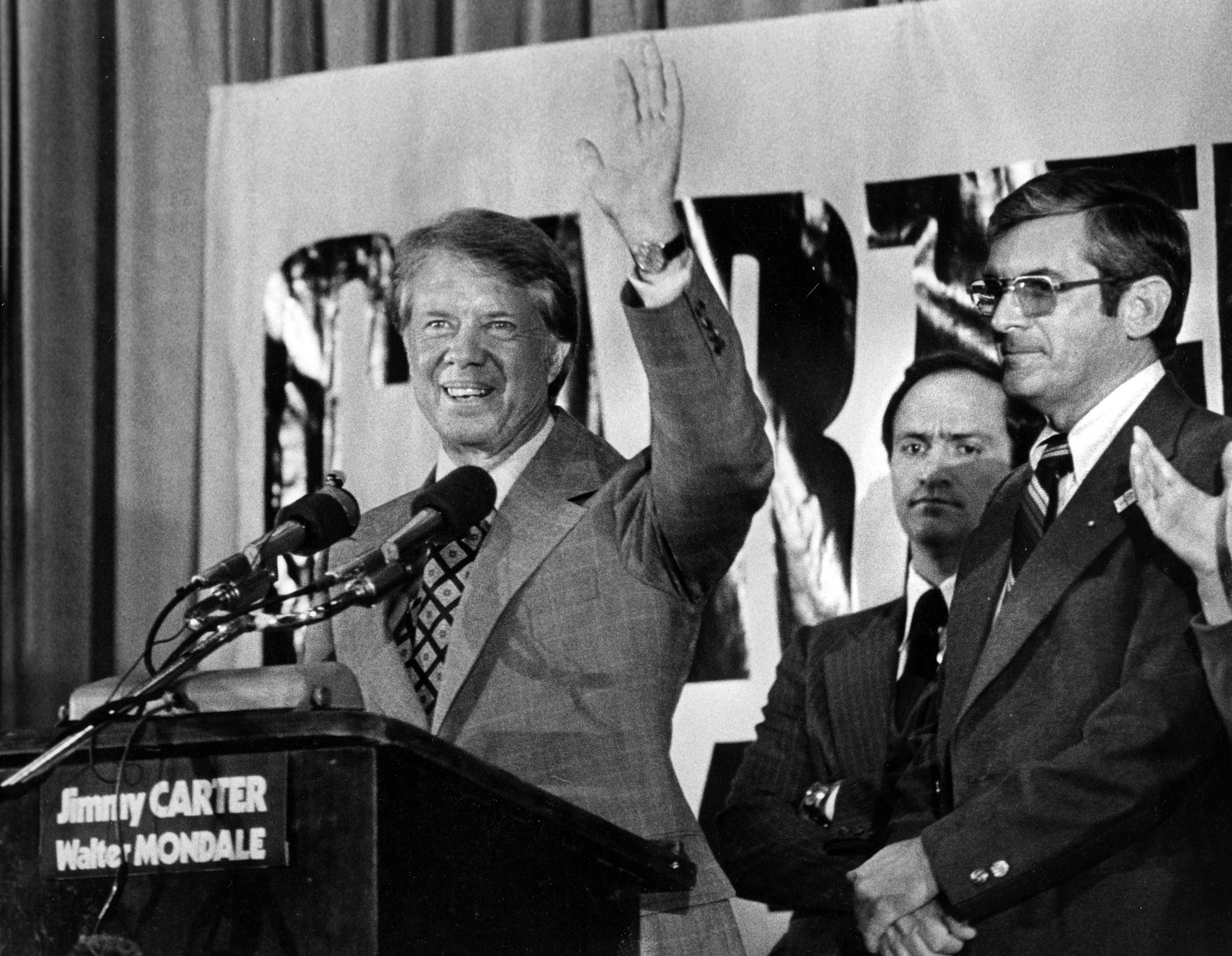 Jimmy Carter was president of the United States 1977-1981, so he would have been on the campaign trail in this photograph.