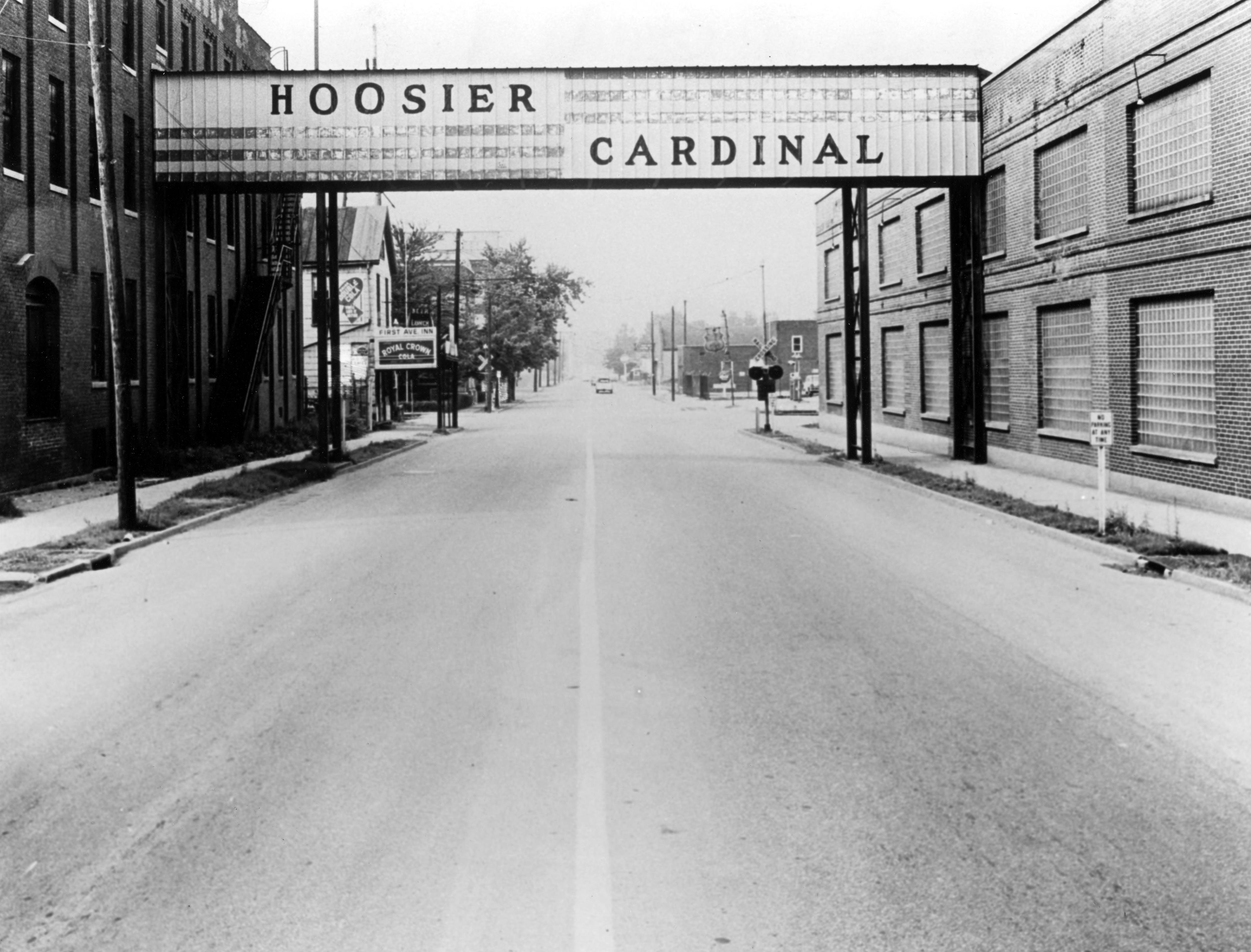 Hoosier Cardinal, which was founded in 1937 by Thomas Jesse Morton Jr. It was an injection molding plastic company. The building, at 605 W. Eichel Ave., still stands. Today, another plastics business, named Indiana Cardinal in honor of Hoosier Cardinal, occupies this same factory space. NOTE: the company was founded earlier than this, beginning as a a stamping company that made metal refrigerator parts, including ice cube trays. Evansville used to be known as the Plastics Hub of the Nation. The modern plastics industry dates back to 1935 to a businessman named Thomas Morton, Jr., who owned Hoosier Cardinal, a stamping company that made metal refrigerator parts, including ice cube trays. One day Morton was introduced to a man named Jack Bauer, whose father owned a machine company in Springfield, Ohio. Bauer had the idea of making a better ice-cube tray out of plastic. It could be done with a new injection-molded plastics method developed in Germany. This photograph was identified as when the company was shifting its remaining operations to Belton, SC. Photograph from the Evansville Courier. According to Home Town History, this service bridge is over FIrst Ave. Employees and production goods were delivered from one plant to another for decades. In the far background is the First Avenue Bridge.