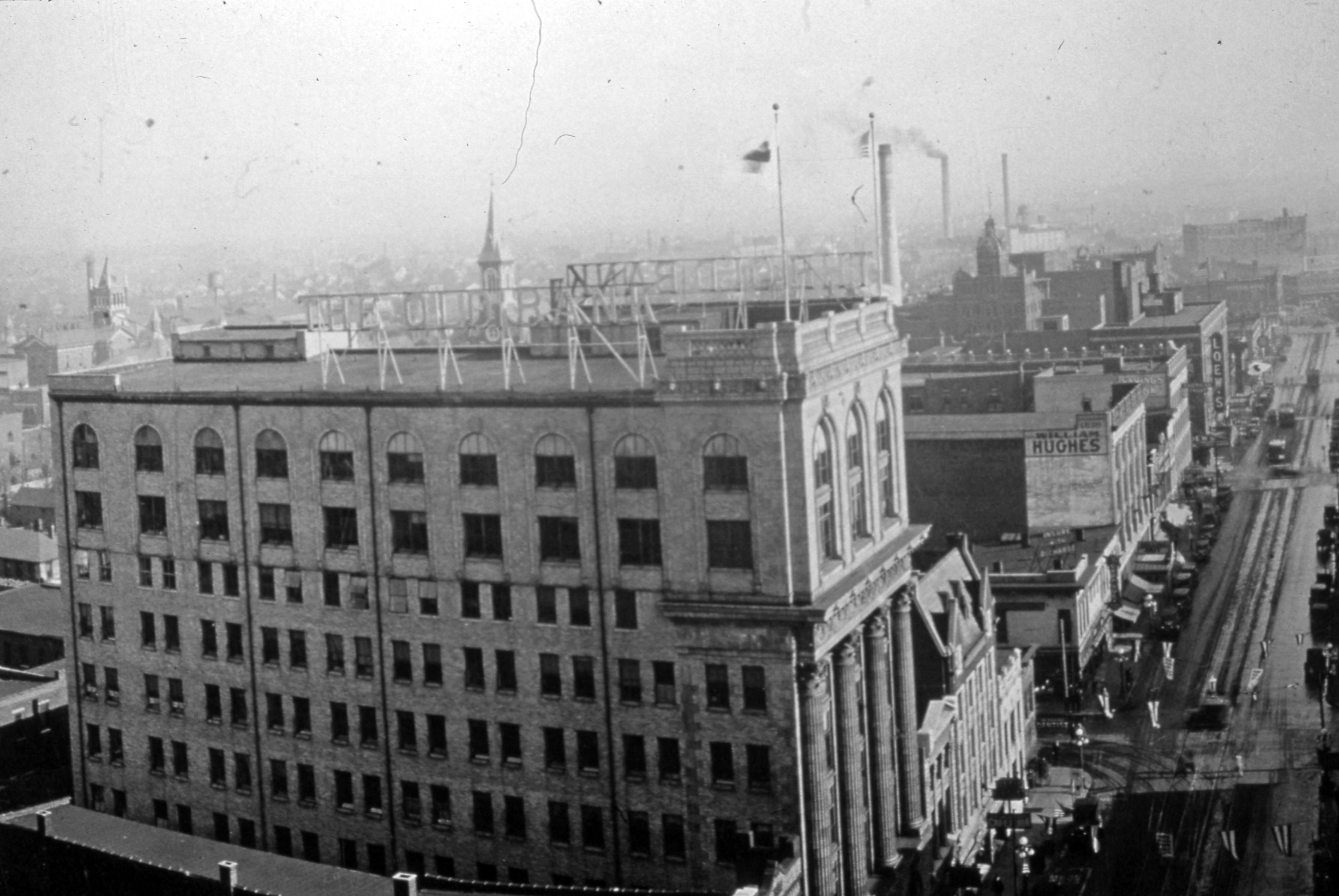 Aerial view of Old National Bank at 420 Main St. The bank began in 1835 but did not move to this location until 1916. In 1970 the bank moved next door and this building was razed. In recent years the bank's new headquarters relocated to the riverfront in a new and modern building. The lower building with the gables 1 door down from the bank is the Hotel Lincoln, built around 1900 and in 1916 expanded so as to front on Main St. It was razed in 1967. The William Hughes (sign on side visible) building-Hughes Department at 508-514 Main St. opened in 1911, and probably housed the Evansville Dry Goods Store at the time of this photograph. Today it's been remodeled into loft apartments. If you zoom in you can see Loew's Victory Theatre at 600-614 Main St., which opened in 1921. Today this theatre has been completely restored and is the home of the Evansville Philharmonic Orchestra.