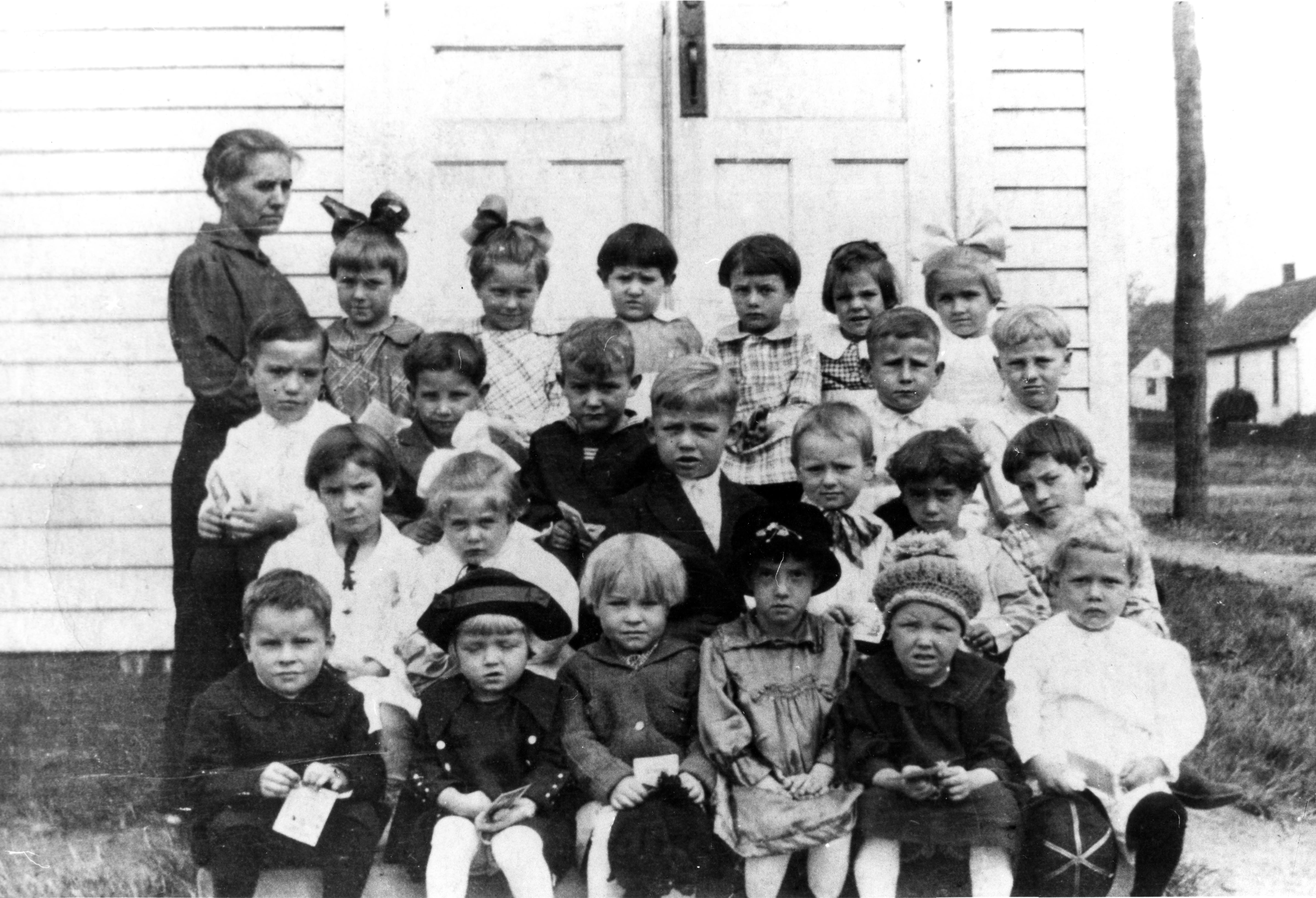 This photograph is unidentified, but most probably it is a teacher and her young students, sitting on the schoolhouse steps.