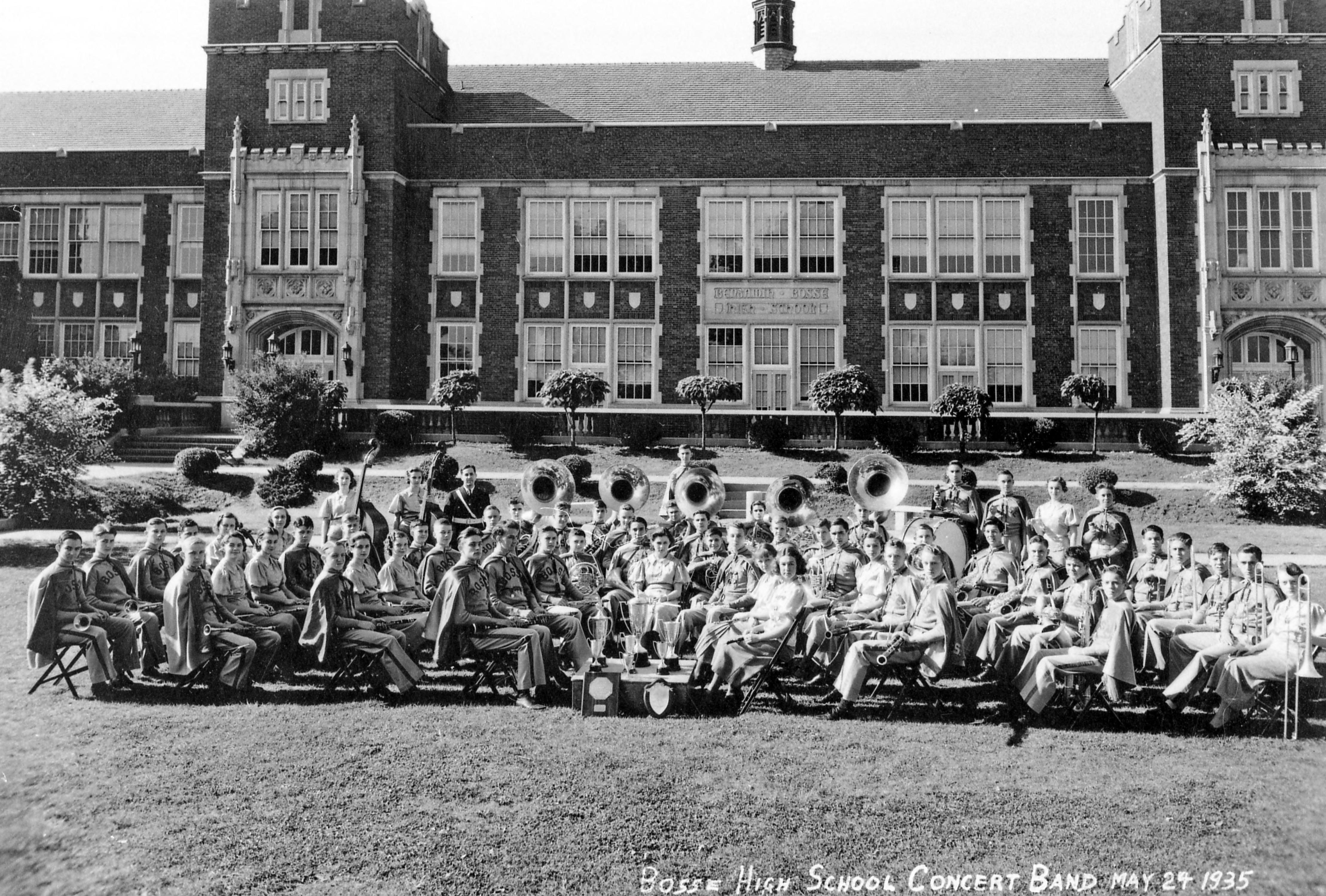 Benjamin Bosse High School concert band sitting in chairs on the lawn in front of the school at 1300 Washington Ave. There are trophies in the middle, so apparently the band won some recognition. Bosse, named after Evansville mayor Benjamin Bosse [who unexpectedly died in office at the age of 47], became the citys third high school. Bosse was built between 1923-1924 to serve the expanding population to the east of downtown. The school opened its doors to juniors from Old Central on January 29, 1924 and graduated its first class in 1925. It even served as an elementary school (Bosse Elementary) until Washington Elementary opened in 1937. A major renovation from 1993 to 2000 maintained the same style as the original building. Bosse High School exemplifies how a historic school can be functional while remaining an architectural showpiece.