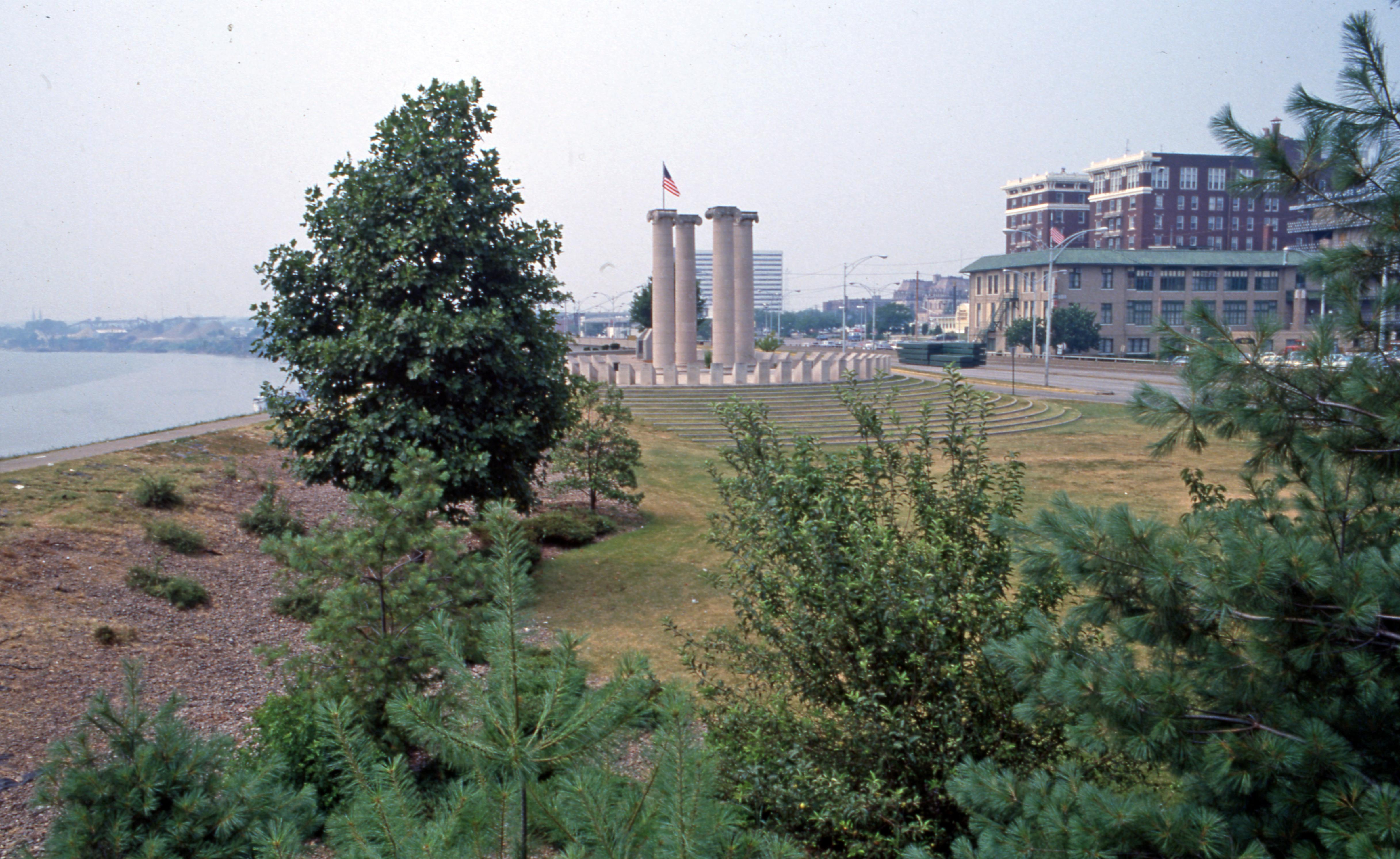 In this view of the Ohio River front, the 4 pillars are the Four Freedoms monument. at 267 SE Riverside Dr. Evansville's most recognizable landmark, the Four Freedoms Monument, is a numerical testament to the United States' most treasured freedoms. Thirteen concentric steps, representing the original 13 colonies, lead to four columns, which are surrounded by 50 pedestals that each bear the name and seal of one state from the Union. The limestone columns, which were originally built in 1882 to adorn the entrance of the C&EI Railroad Depot in Evansville were salvaged in 1961 at the Depot's demolition and given a new purpose 15 years later. The Four Freedoms Monument was erected in 1976 in celebration of the U.S. Bicentennial. Four smooth-shafted, ionic columns act as 26-foot tall evocative reminders of: the freedom of speech, freedom from oppression, freedom of religion and freedom from fear. Some also suggest the circular base on which these four columns sit symbolizes a fifth freedom, the freedom to peacefully assemble, which many groups do at this site regularly. (http://www.celebrateevansville.com/four-freedoms/) To the right, the double towers are the Hotel McCurdy at 101-111 SE 1st St., formerly 401-415 Upper 1st St. The McCurdy Hotel was developed as a luxurious facility to aid the city's expansion efforts . It was named after Col. William H. McCurdy, local industiralist and investor. The aging St. George Hotel, on the existing site, was razed in 1915 to build this magnificent hotel. Designed by H. Ziegler Dietz, the U-shaped, 8-story building featured a grand Rose Room located on the top floor. The hotel was built in opened for business on June 17, 1917. During its heyday, the McCurdy was operated as a Van Orman hotel. According to the Courier & Press' archives, several prominent guests stayed at the McCurdy including Katharine Hepburn, Clark Gable, Sen. Joseph McCarthy and Richard Nixon. Business at the hotel dwindled in the late 1960s and McCurdy fell into bankruptcy. The hotel closed its doors March 16, 1969. Local businessman Robert E. Green bought the hotel and reopened it. By October 1970, however, Green sold the building to Medco Corp, which stated its intention to turn it from a hotel into a residential facility and retirement home. In 1989, it was resold again, becoming the McCurdy Healthcare Center. In June 2006, McCurdy was renamed Riverwalk Communities and changed its cliental focus. After several violations and citations from the Board Of Health, the facility agreed to cease operations. Plans are in place now to convert the building into upscale apartments. These apartments are being leased as of 2018. The green-roofed building is the Hadi Shrine at 6 Walnut St. This building was built in 1910 as the second location of the Gilbert Hospital/Gilbert Sanitarium. The Shrine moved in in 1923.