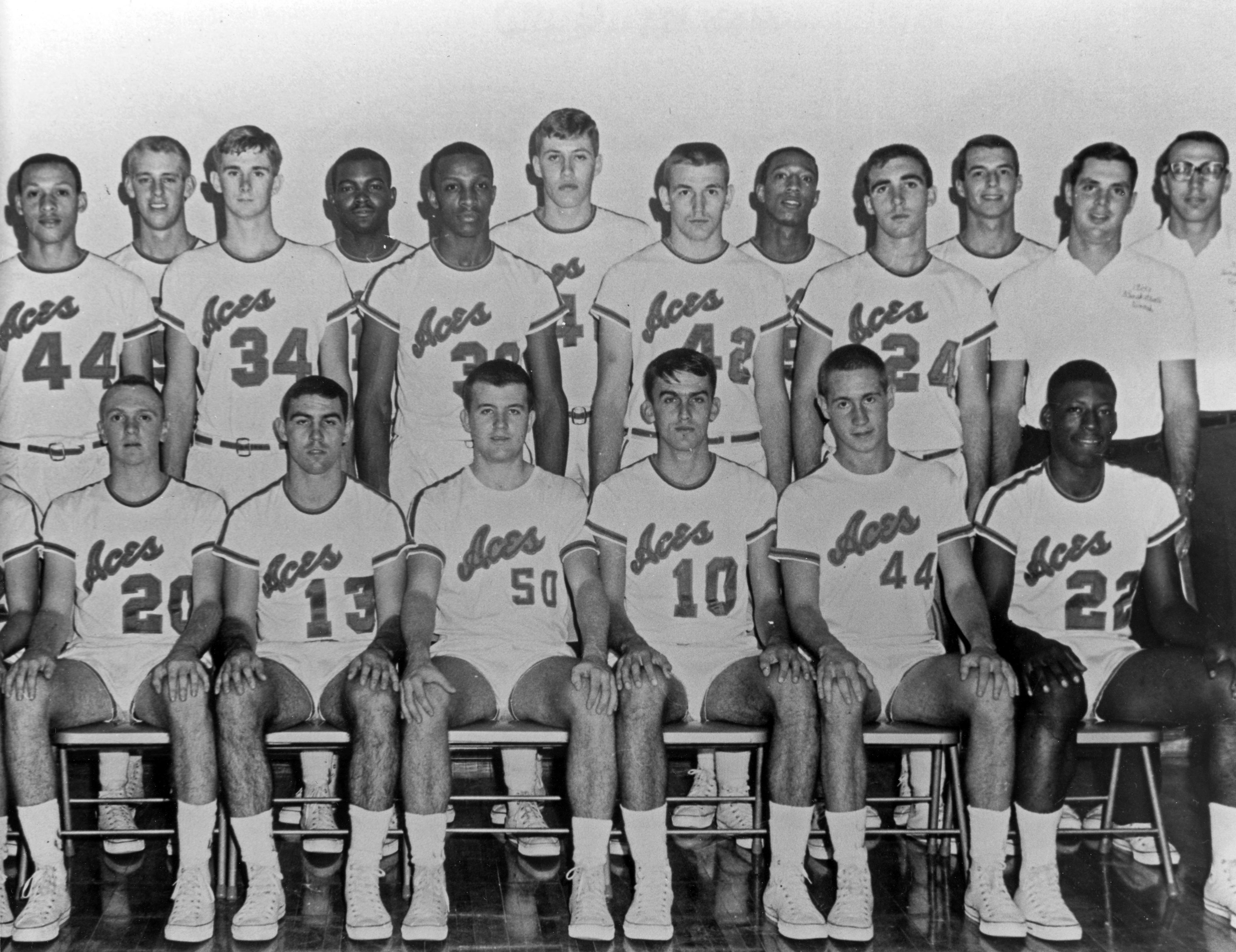 Evansville College basketball team. L to R (Back row) Darryl Adams, Sam Watkins, Howard Pratt, Larry Humes, Gary McClary and Asst Coach Roger Kerr (Middle Row) 44 Woody Gordon, 34 Roger Miller, 30 Herb Williams, 42 Bill Simpson, 24 Jerry Mattingly and asst. Wayne Boultinghouse (Front Row) 20 Rick Kingston, 13, Don Jordan, 50, 10 Dave Riggs, 14 Ron Bae, 22 Terry Atwater. In 1964 and 1965 the Aces won the NCAA Division II tournament. In 1977 the school moved up to Division I.