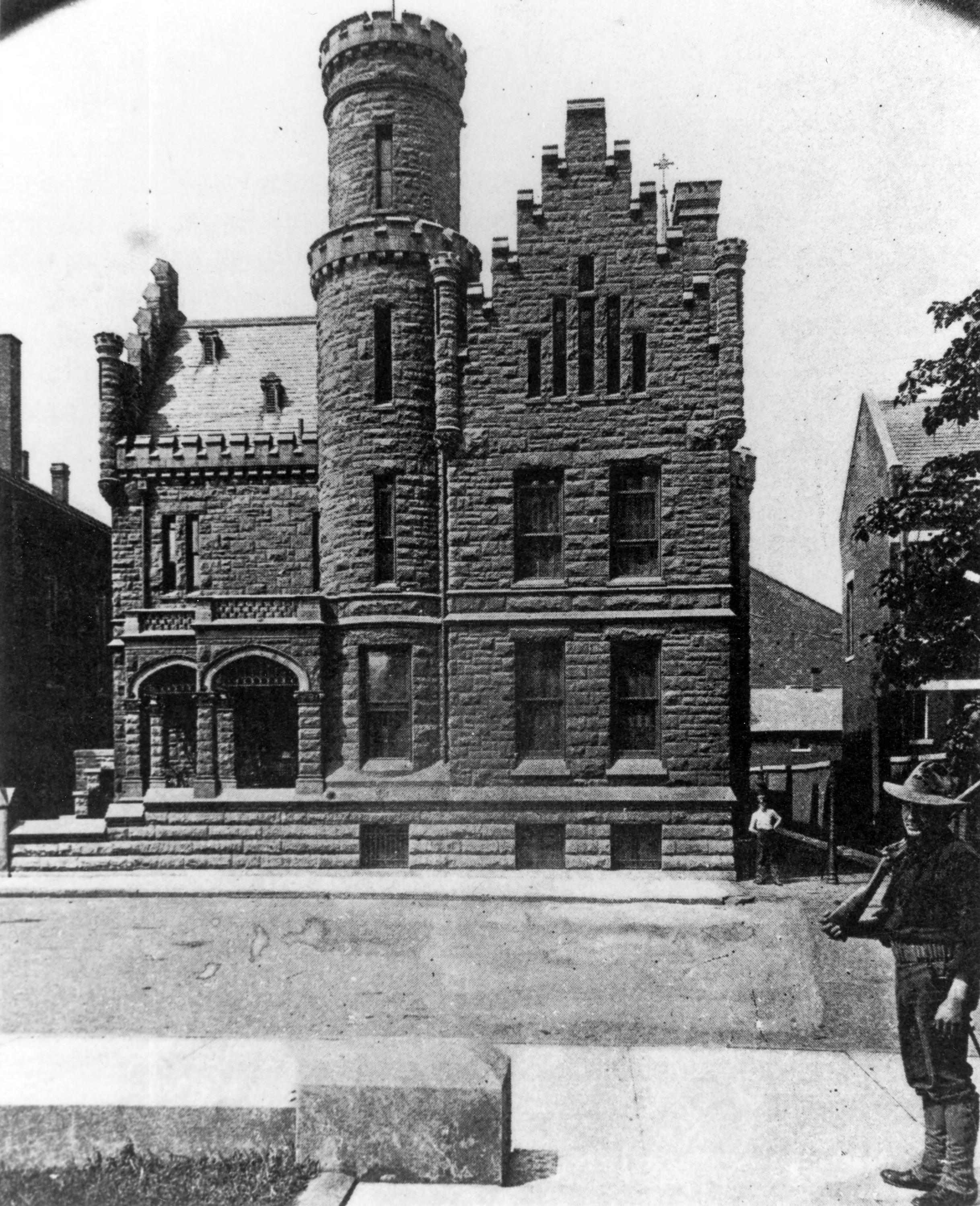 Old Vanderburgh County jail at 208 NW 4th St. Built in 1891 and modeled after the Lichtenstein Castle in Baden-Wurttemberg, Germany, this building also housed the sheriff. It was intentionally designed to be intimidating. The old courthouse is across the St., and the two are connected by a via a tunnel. This building still stands, but today houses a law firm.