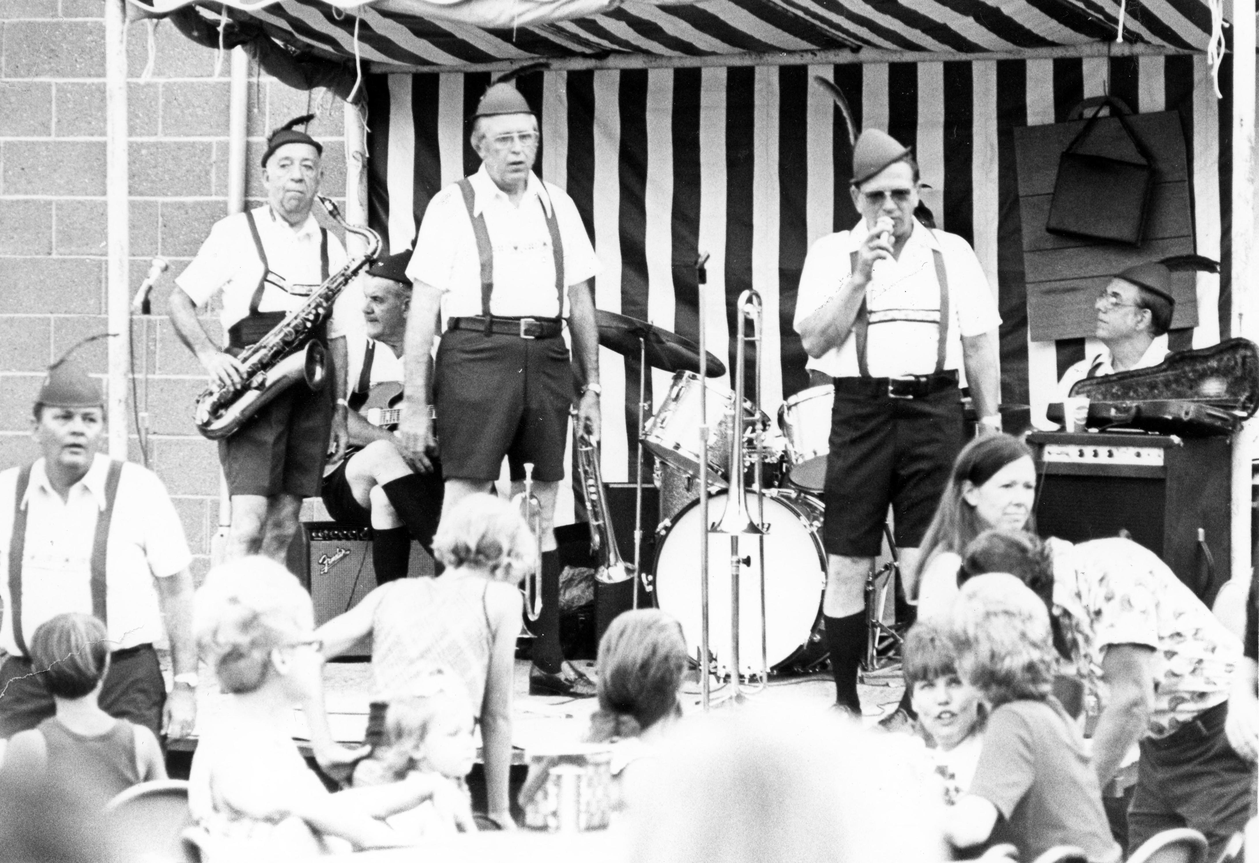 Music group wearing German-style costumes, and tables of people listening to them. The Evansville area has a strong German culture, and there are any number of summer festivals like this.