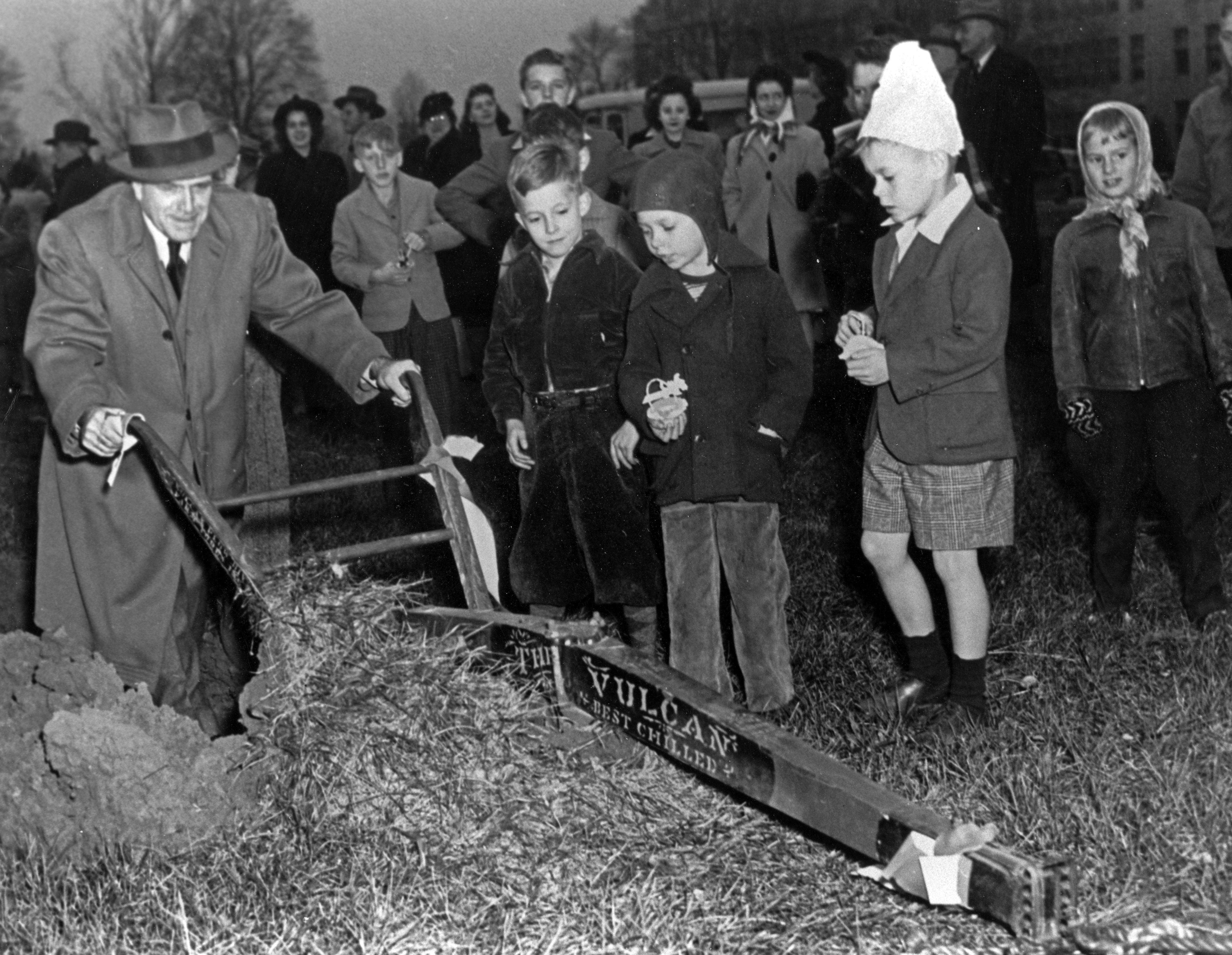 Louis Ruthenberg using a Vulcan plow to break ground for the engineering and science building at Evansville College. The University was founded in 1854 as Moores Hill Male and Female Collegiate Institute in the little town of Moores Hill in Dearborn County in southeastern Indiana. The first college building at Moores Hill was completed on December 1, 1856, although the opening day of classes for the new college was held in the building on September 9 of that year. A cornerstone was laid for a second building over 50 years later on June 12, 1907. The new building was dedicated on June 18, 1908, and named, Carnegie Hall, after the chief donor, Andrew Carnegie. On March 21, 1917, George S. Clifford made a presentation at a special session of the Indiana Conference of the Methodist Church proposing to move the college to Evansville, Indiana. Clifford had prepared a map showing that if a circle with a 50-mile radius was drawn around each of the colleges within the state, none touched Evansville. After deliberation, the school was relocated to Evansville in 1919 and renamed Evansville College. In 1967, after continued growth and organizational changes, the name was changed to the University of Evansville with the approval of the Indiana State Legislature. Vulcan plows were made in Evansville by the Heilman Plow Works, later the Vulcan Plow Works. The man pushing the plow is believed to be the Louis Ruthenburg (1888-1969) who was chairman of the board for Servel, although it could be his son, Louis C. Ruthenburg (1916-1988) with Sign Crafters. Photograph from the University of Evansville.
