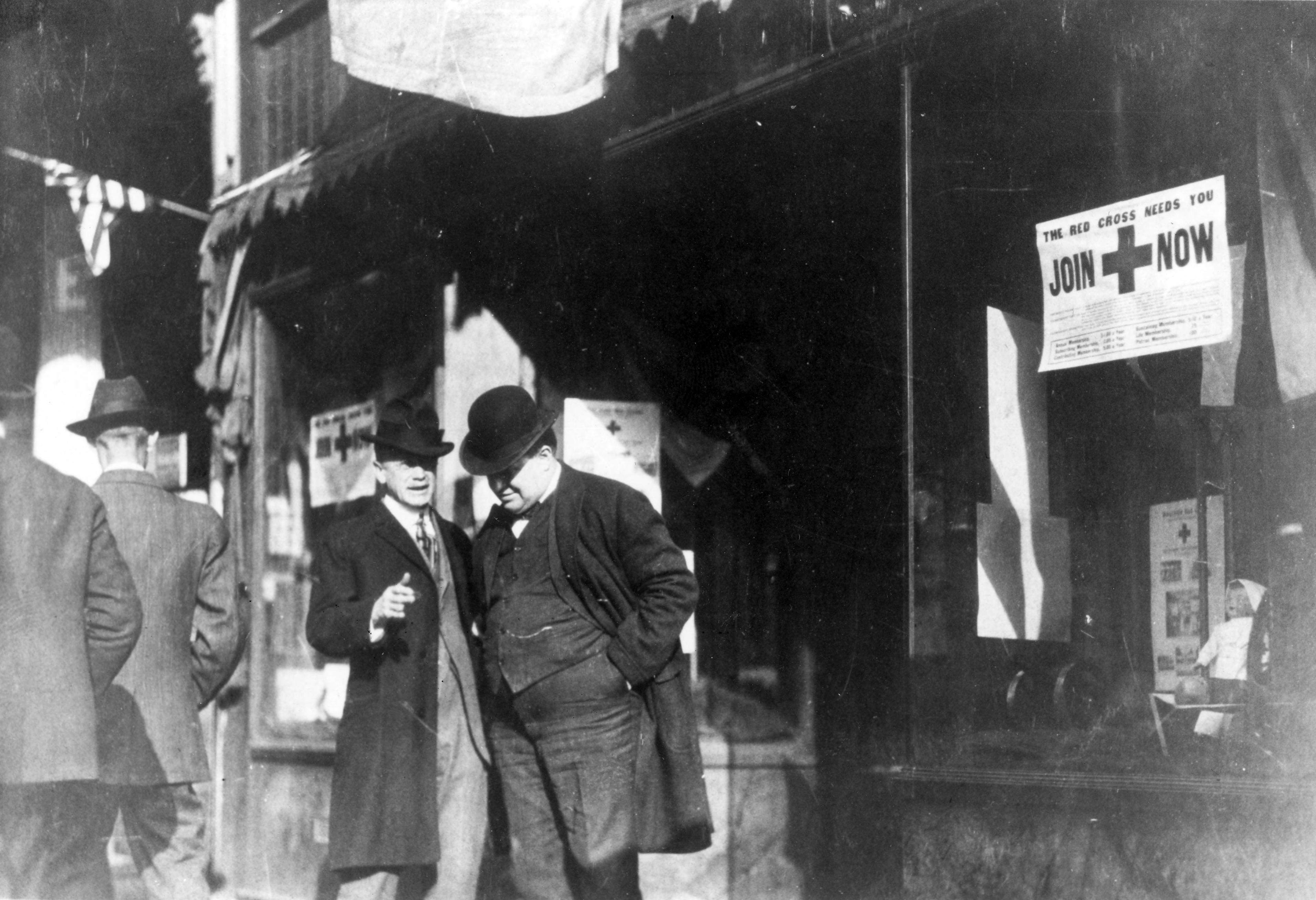 George Sonntag Clifford (left) and Benjamin Bosse in front of Red Cross building. (specific location unknown) Clifford 1858-1927) was a member of a prominent Evansville family and instrumental in the establishment of Evansville College, now the University of Evansville. Bosse (1874-1922) was mayor of Evansville 1914-1922 and died in office in April 4, 1922 at the age of 47. Photograph from the Evansville Courier.
