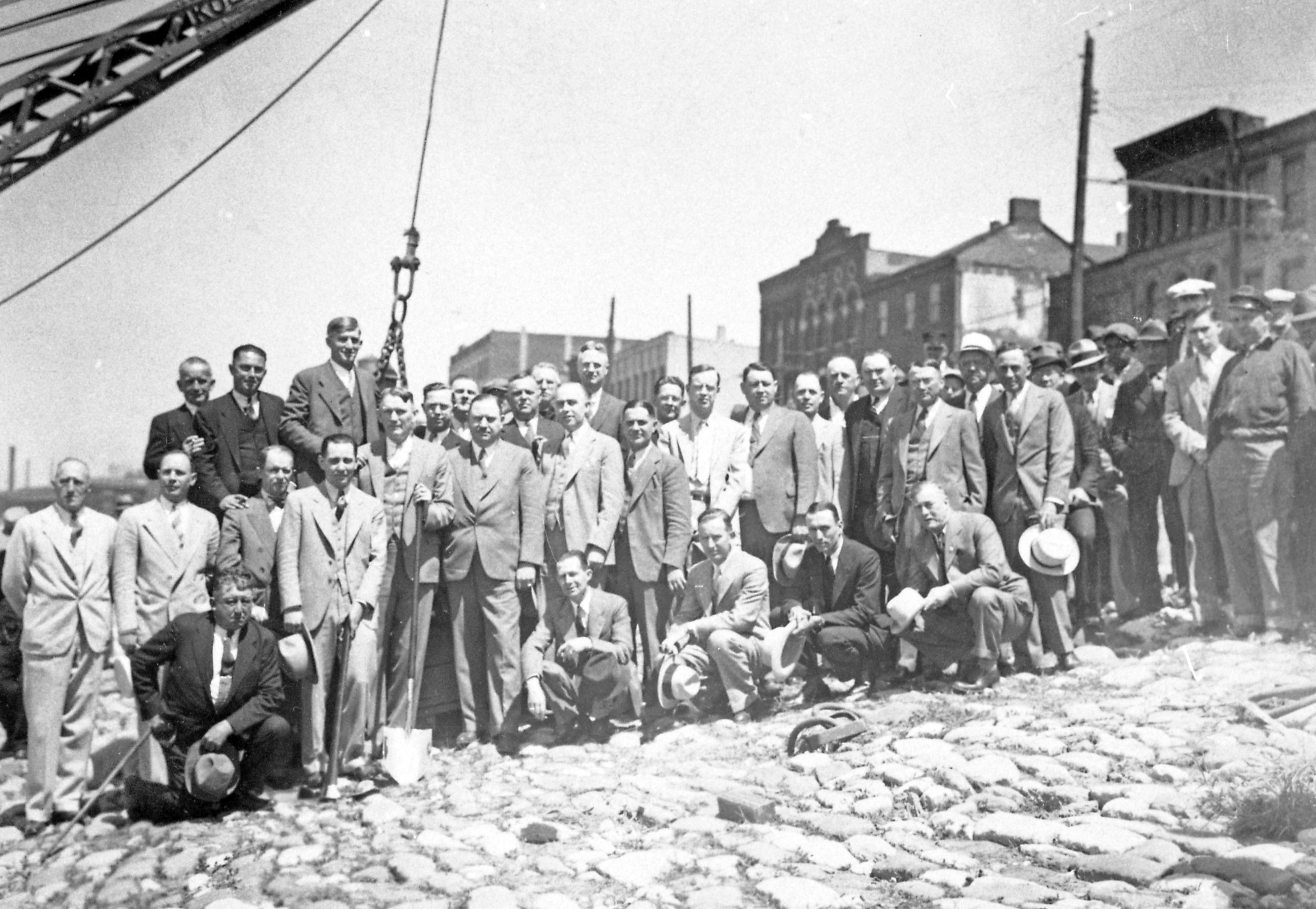 These men are gathered on the Ohio River front to break ground for the construction of Dress Plaza. It was named for William H. Dress, mayor of Evansville 1935-1943, 1948-1949. The man with the shovel is Mayor Dress. This area, which had only been open some 6 months at the time of the 1937 flood, was under water and damaged, but it was rebuilt and remains today.