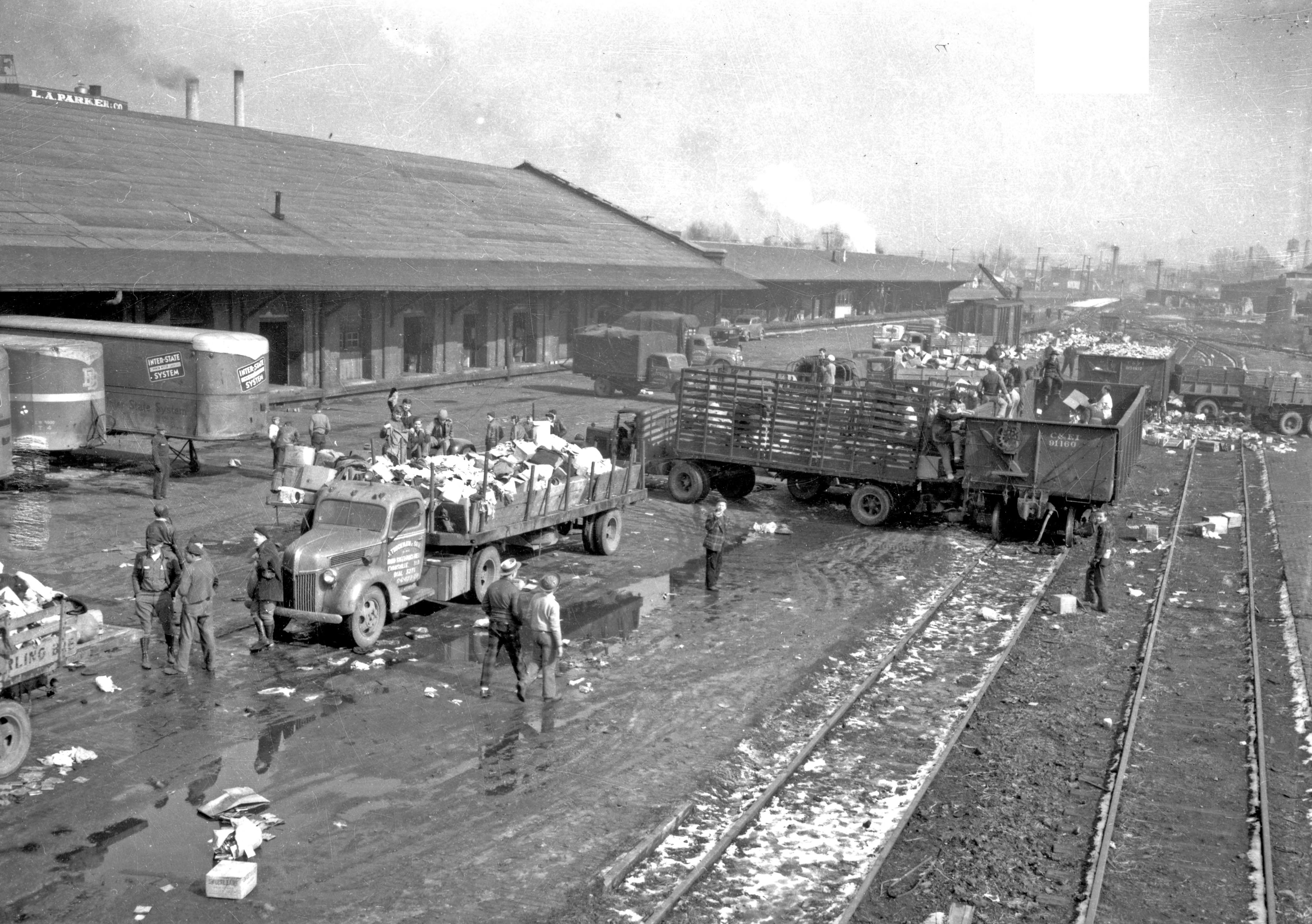 Men load scrap metal onto railroad cars. Theres a J. Trockman and Sons truck in the middle ground. This location is the Southern Railroad Freight Depot on Division St.