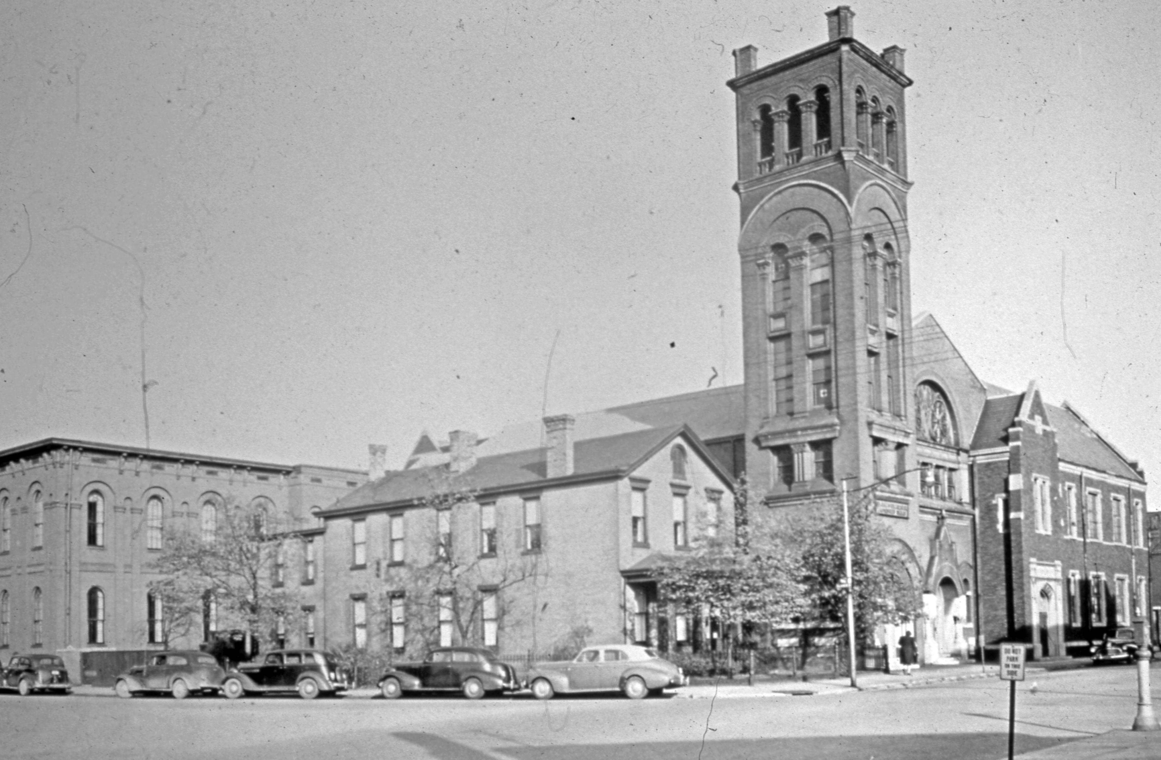 St. John's Evangelical Protestant Church at 321 NW 3rd St. It was built between 1850-1852, with a parish hall added in 1923. A 1950 remodel drastically changed the look of this church; what is seen here is the original. See RH 033-121-120 for the look of the current facility. The parish house and school, visible here, date to the 1860s but have seen been razed. Today this building houses City Church, which gives its address as 314 Market St.