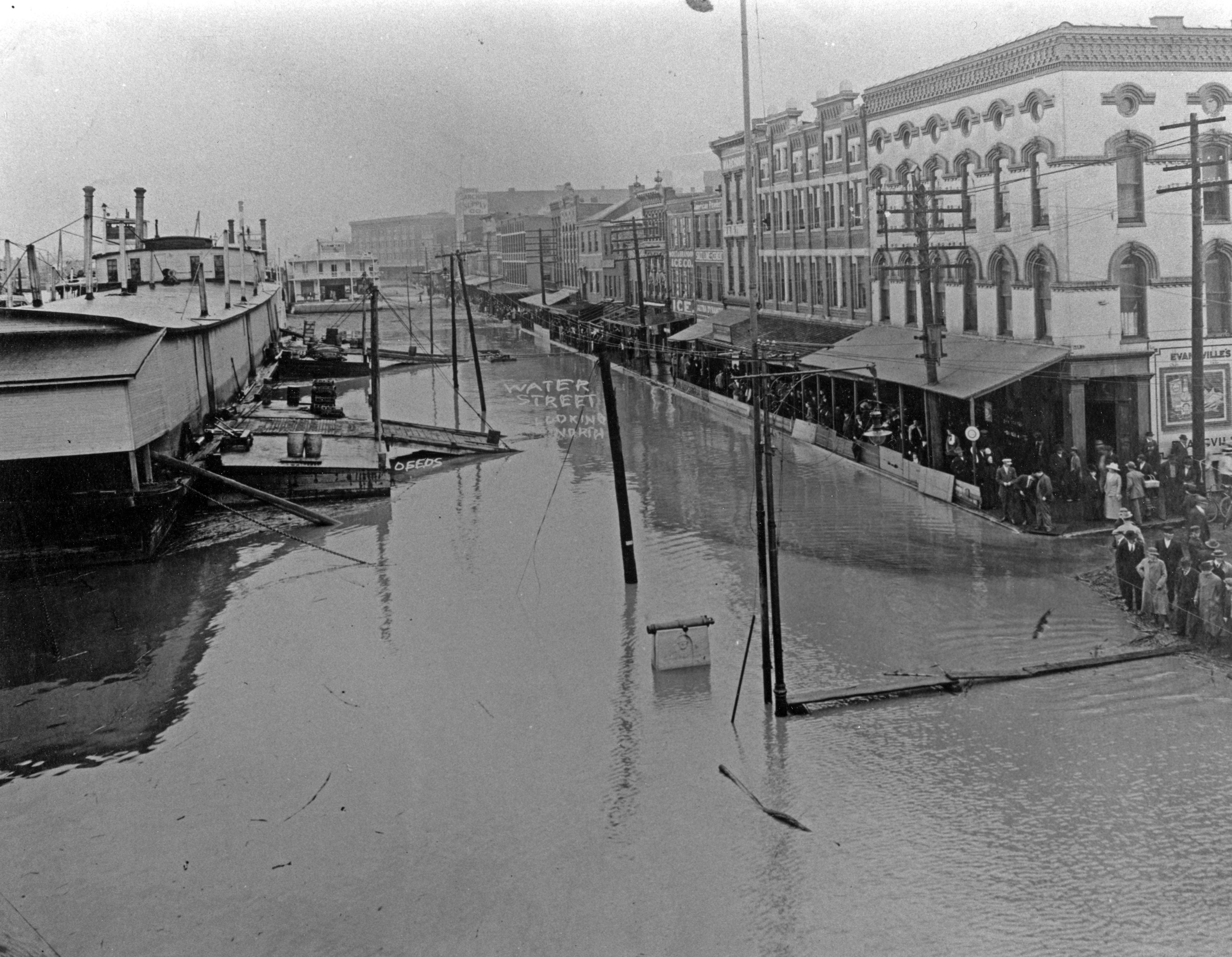 In 1913, in a period of just two days (March 24th and March 25th) Indiana, Kentucky, Ohio, Pennsylvania and New York experienced tornadoes and the equivalent of two to three months worth of rain. A late spring thaw left the ground saturated, or still mostly frozen. As a result, massive flooding began to occur and impacted fifteen states along the Ohio and Mississippi Rivers. In Indiana, communities along the Wabash, White, and Ohio Rivers were most affected by the flooding, which also extended to hundreds of smaller tributaries throughout the state. Flood stage on the Ohio River in Evansville is 35 feet, and on March 29, 1911, the river reached 43 feet. Here the water is up to St. level at Water St. (now Riverside Dr.) and Main St. The showboat is in the background. Photograph from the Evansville Courier.